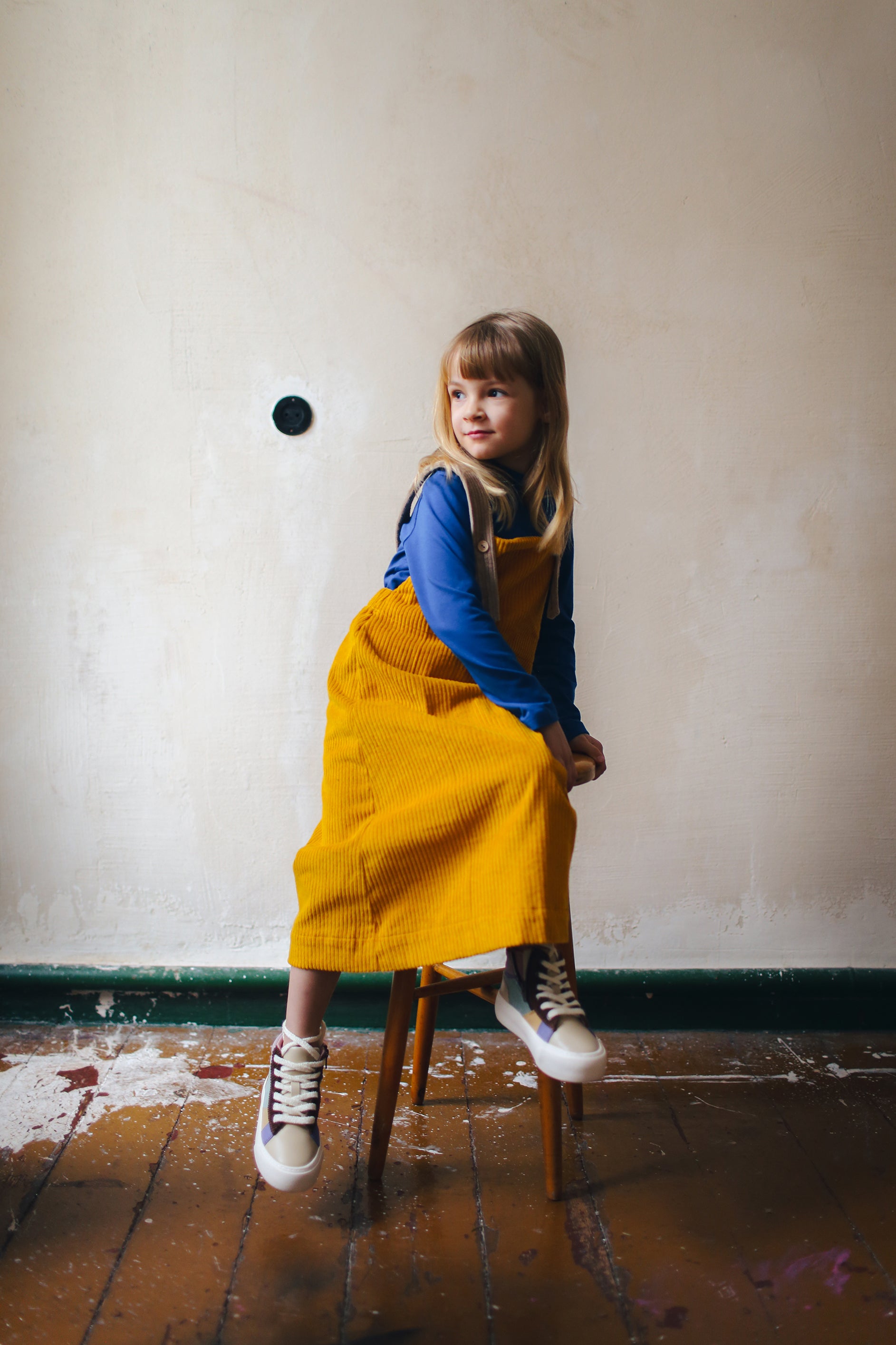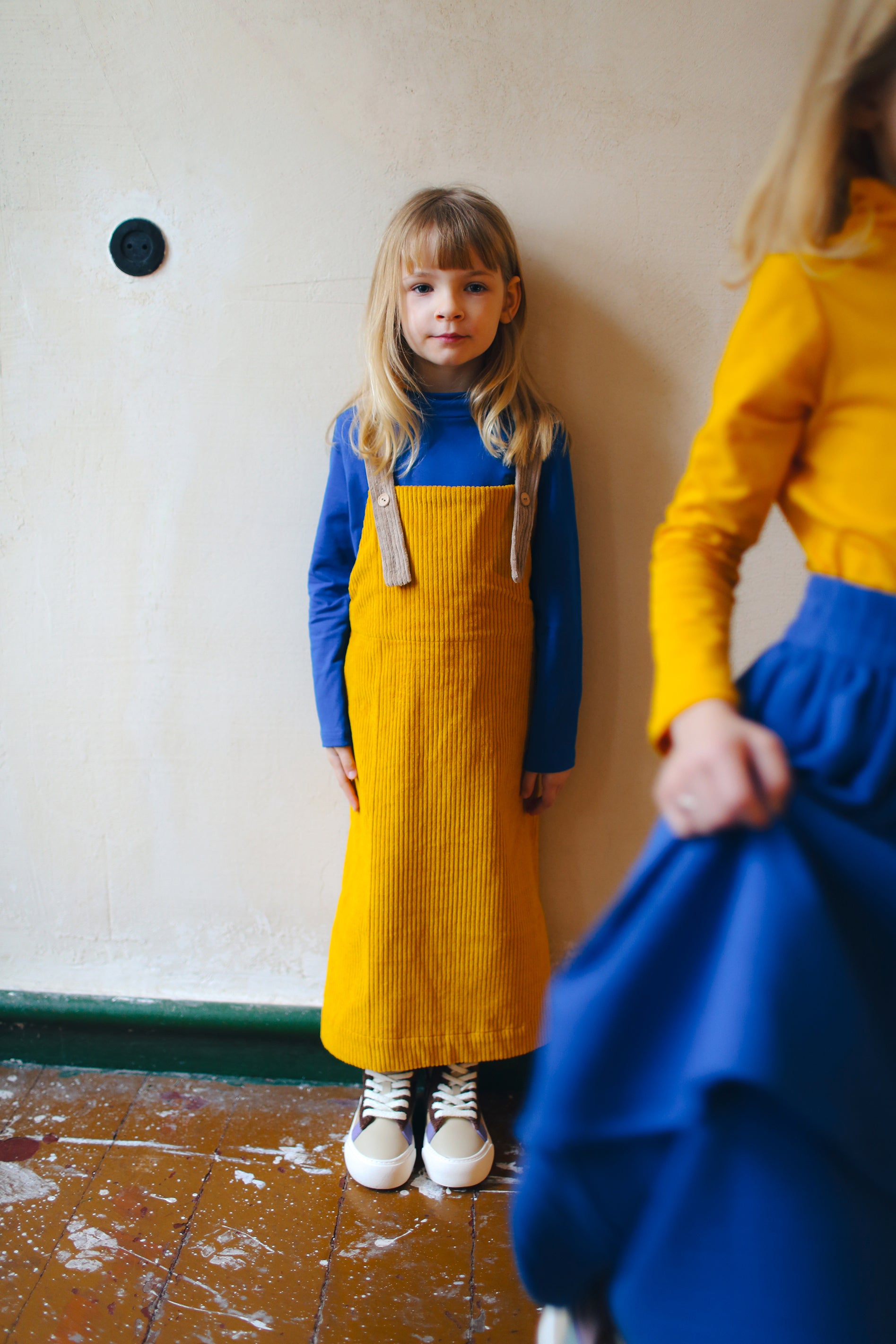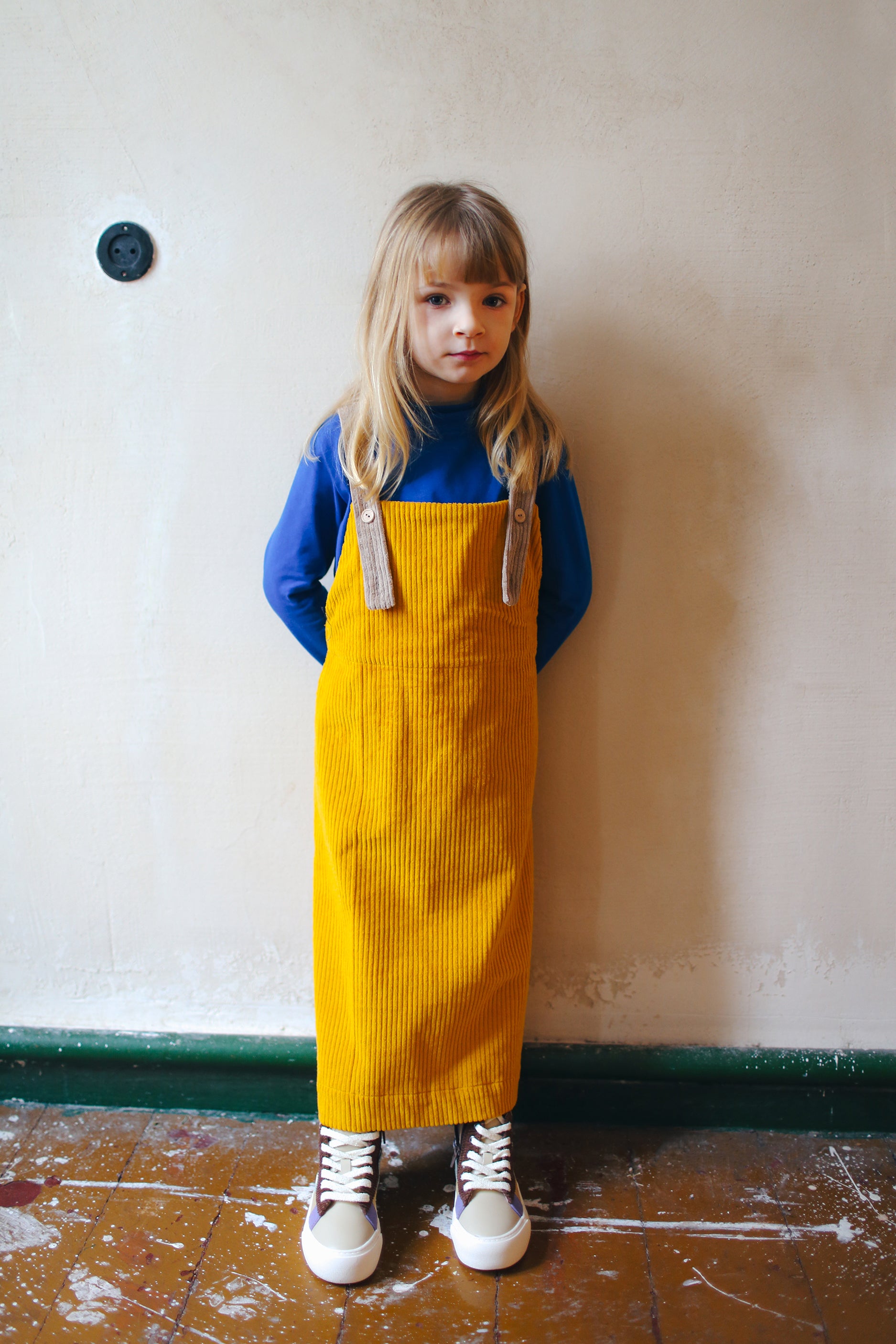 żółta spódniczka ogrodniczka z beżowymi szelkami