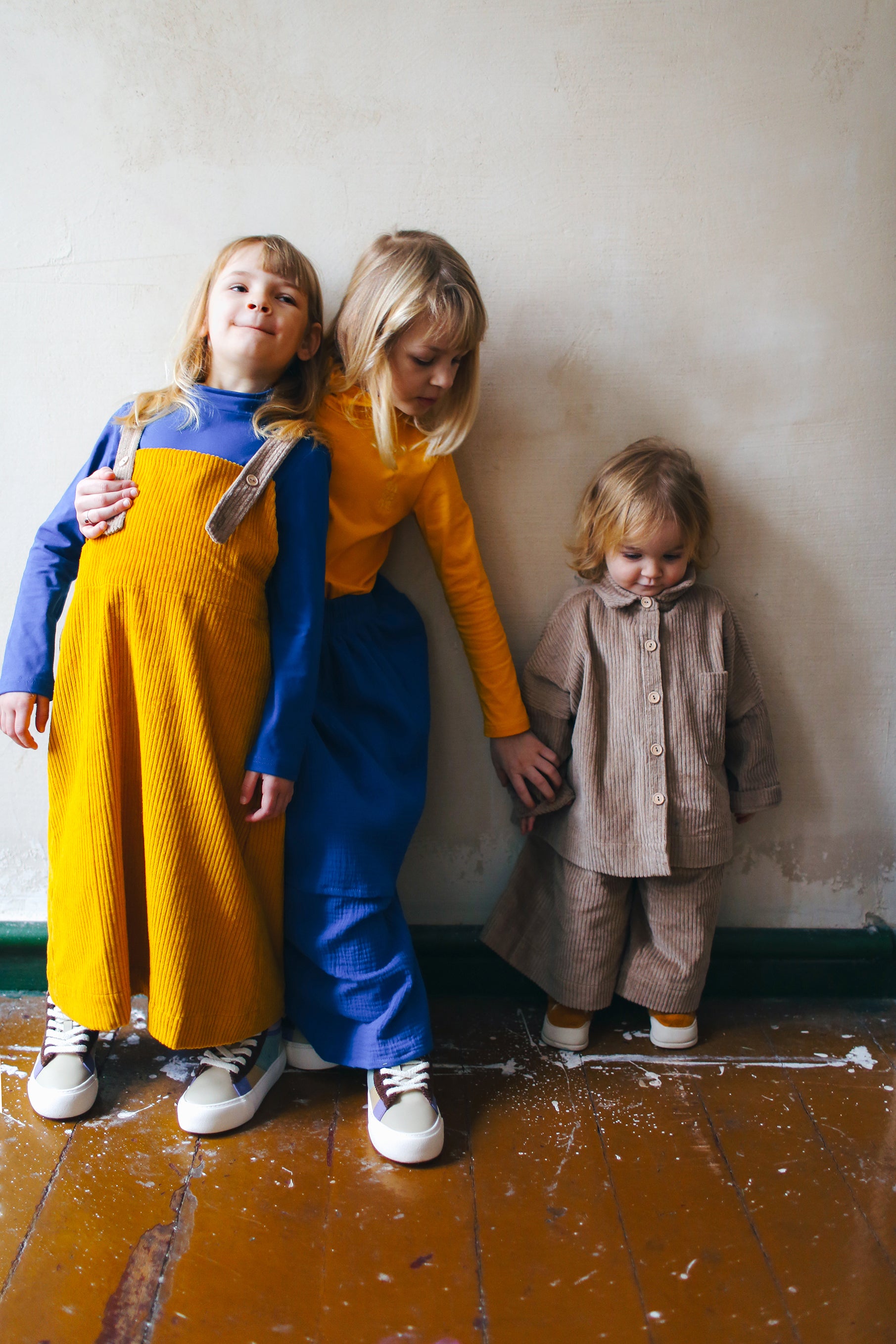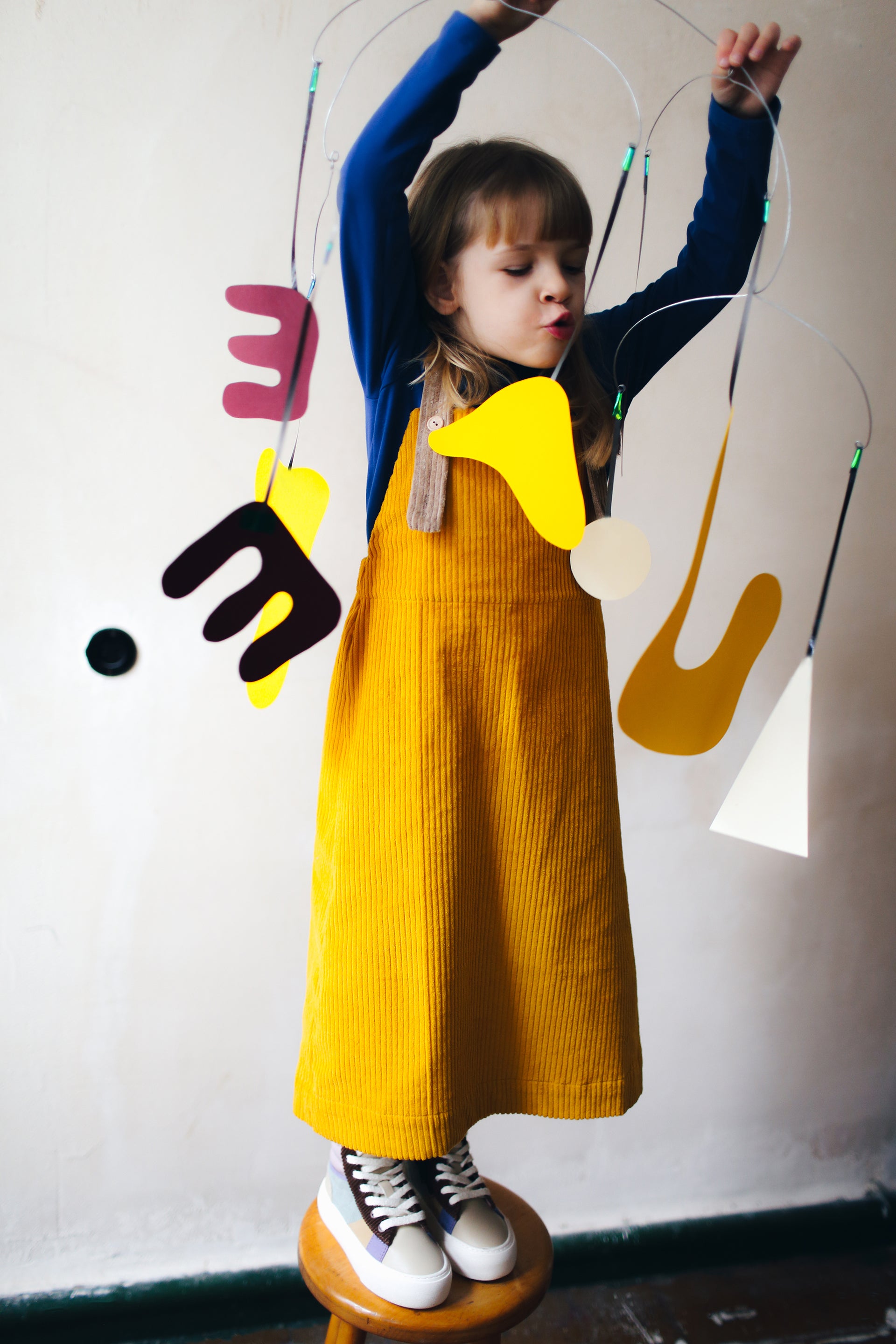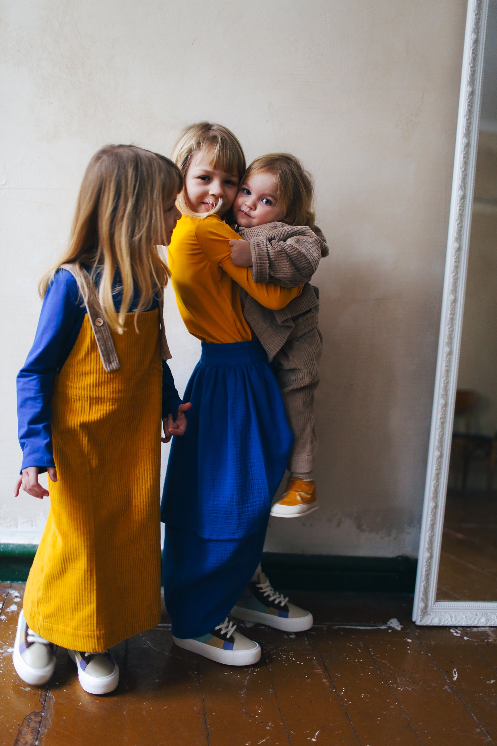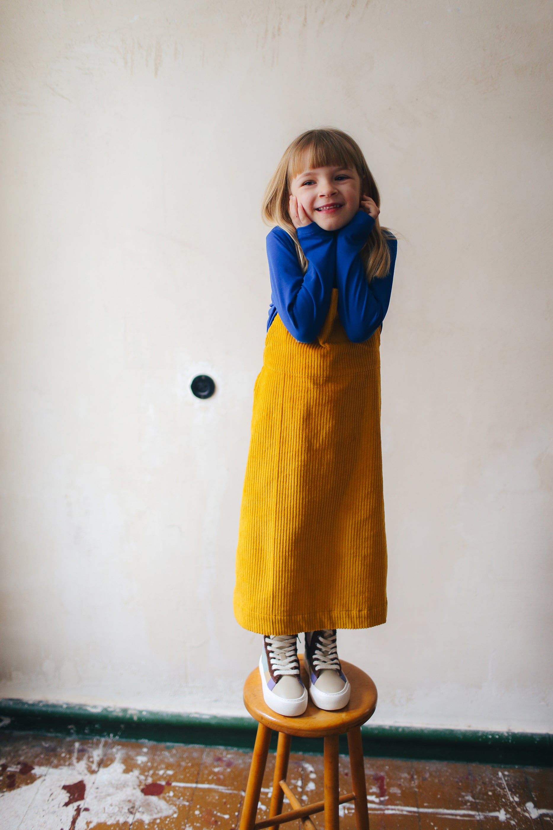 żółta spódniczka ogrodniczka z beżowymi szelkami