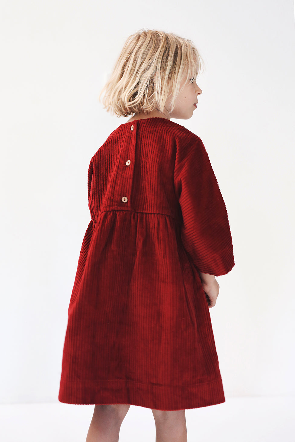 sukienka z guziczkami na plecach z rękawem 3/4 uszyta z miękkiego sztruksu o grubym prążku. dos