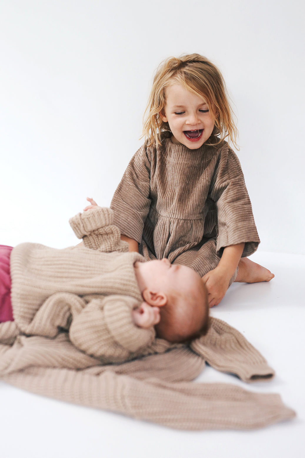 Beżowa sztruksowa sukienka z guziczkami na plecach- model posesyjny