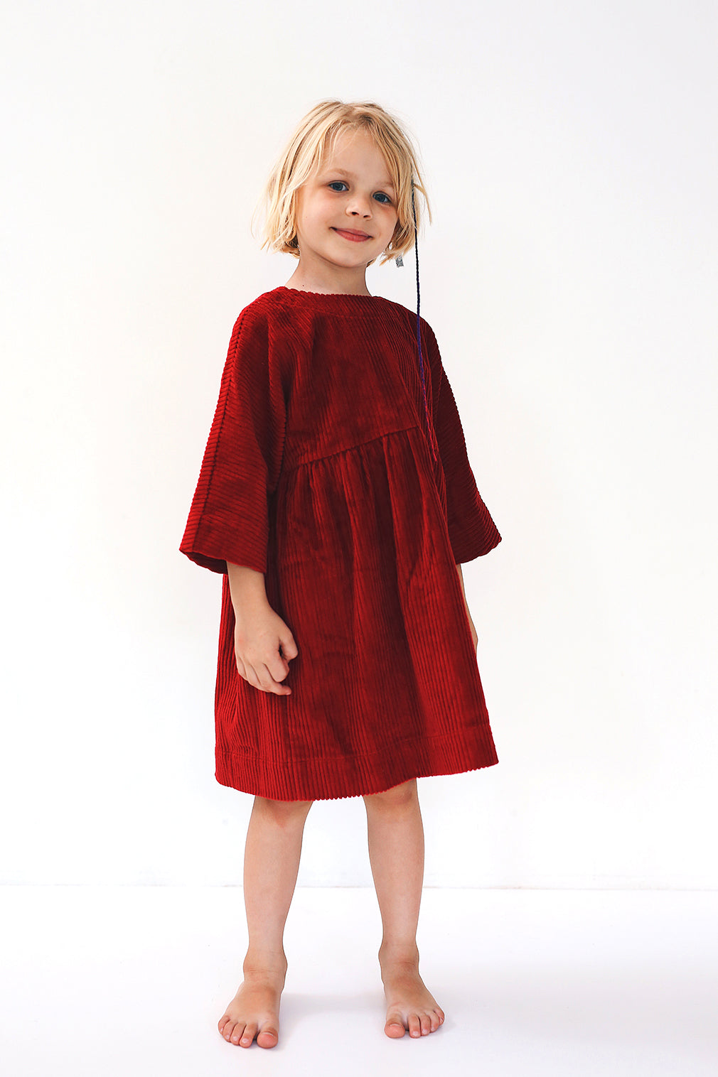 sukienka z guziczkami na plecach z rękawem 3/4 uszyta z miękkiego sztruksu o grubym prążku. dos