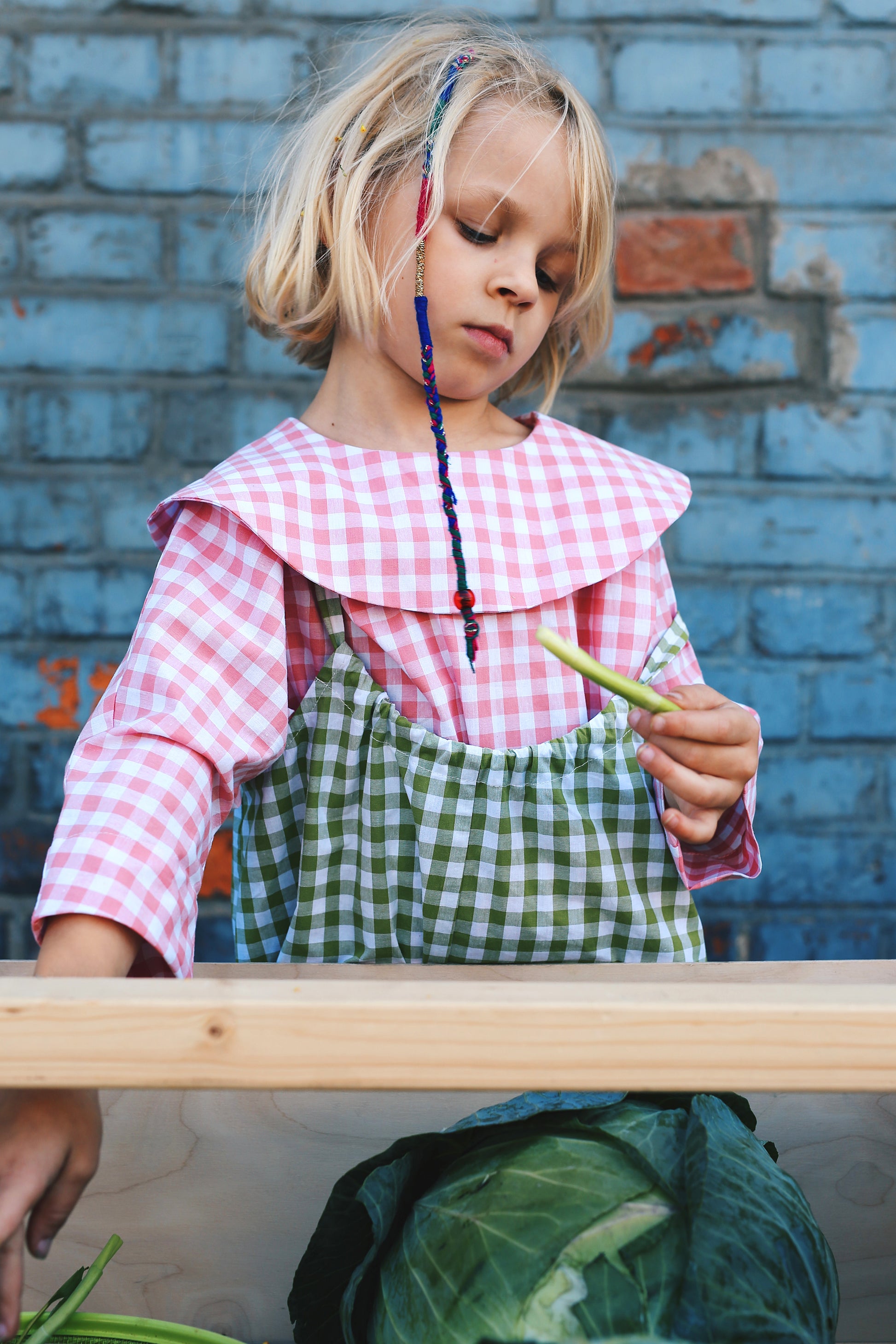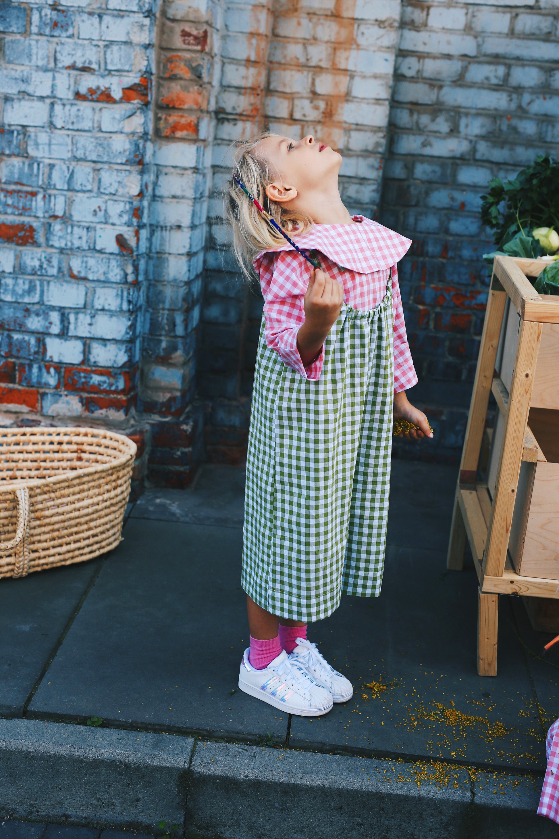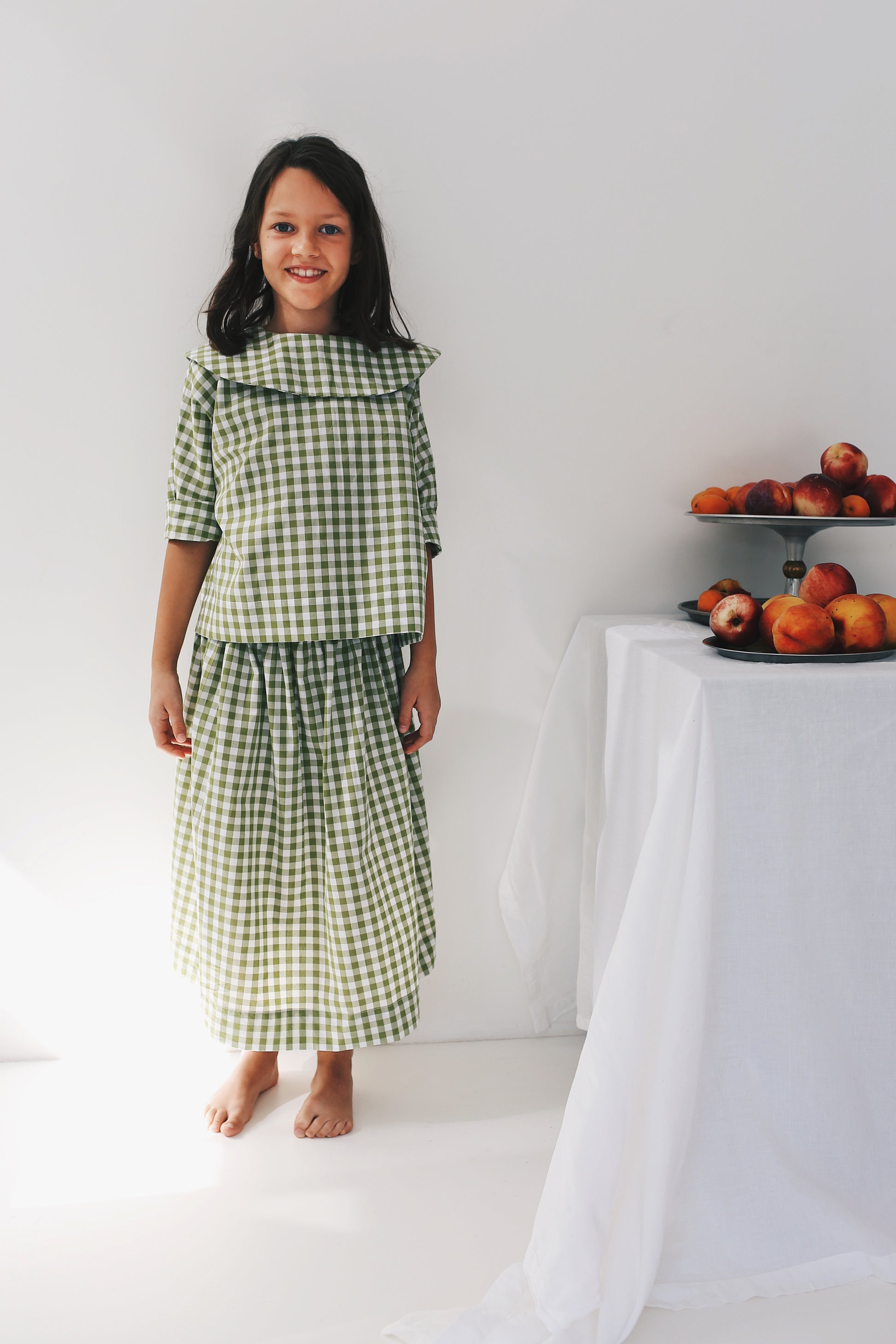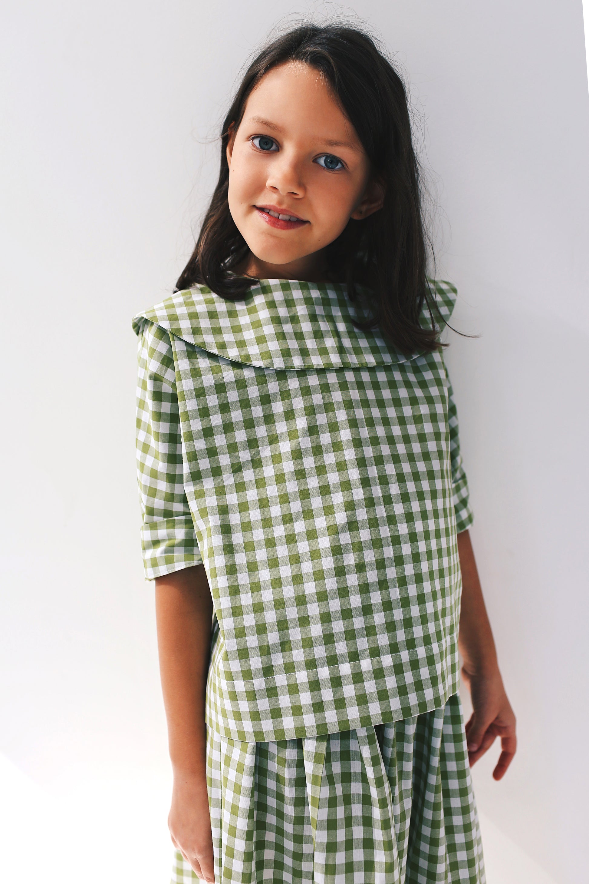 bluzka z krótkim rękawem z dużym, okrągłym kołnierzem. Uszyta z popeliny w biało-różową kratkę. świetnie komponuje się z naszym kulotami w kratę oraz spódniczką midi.
