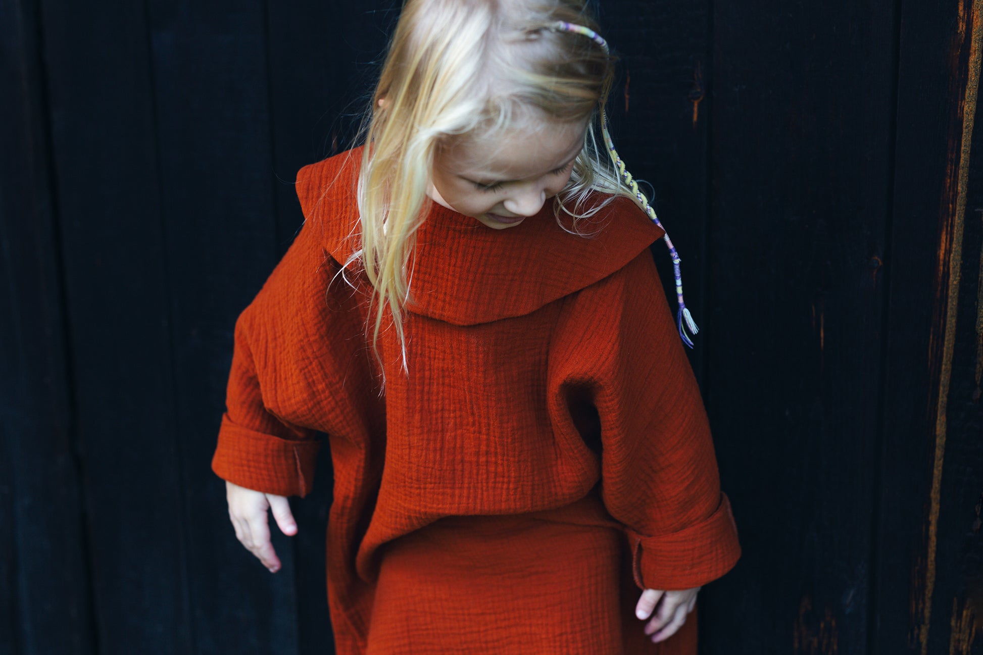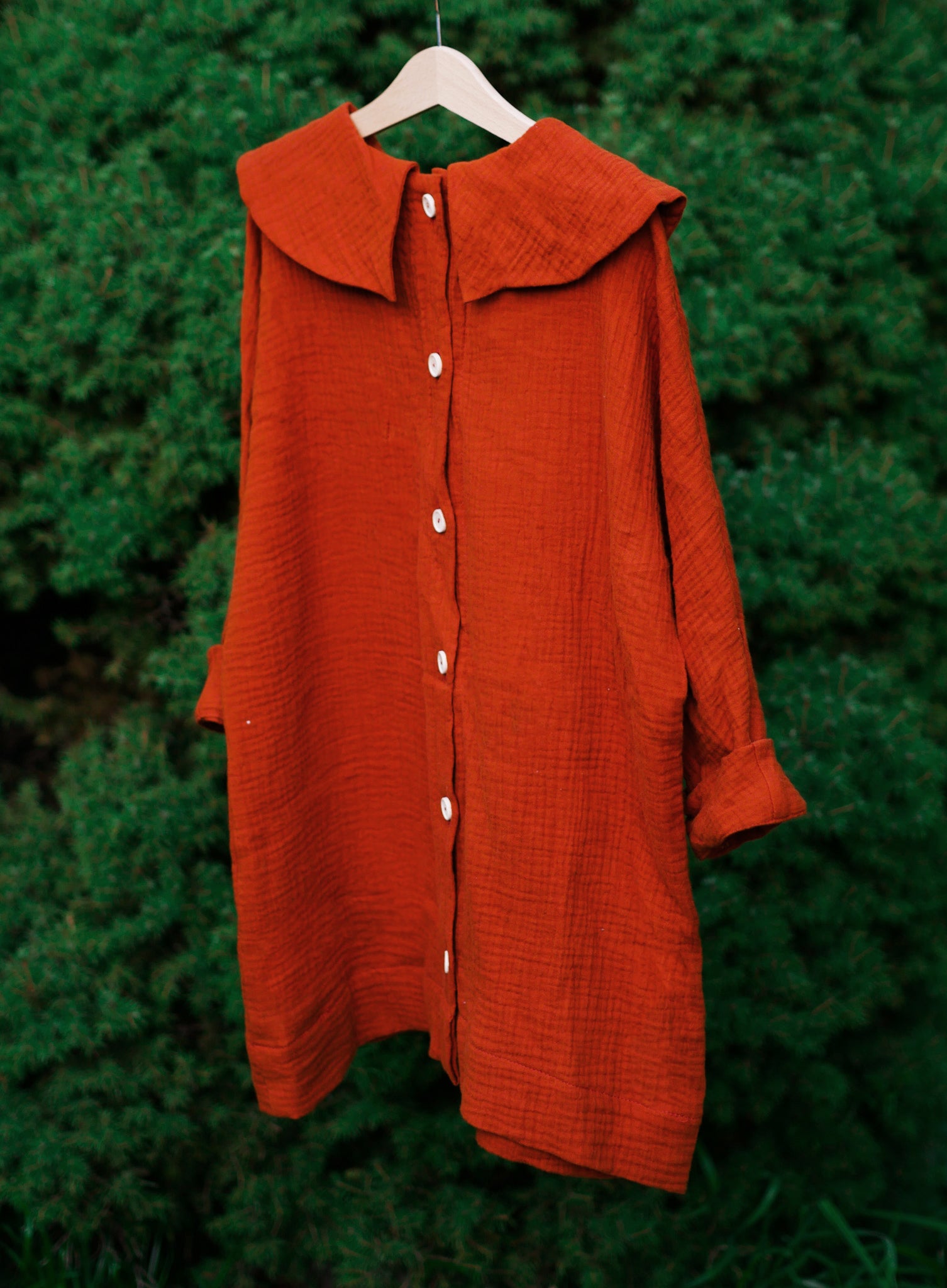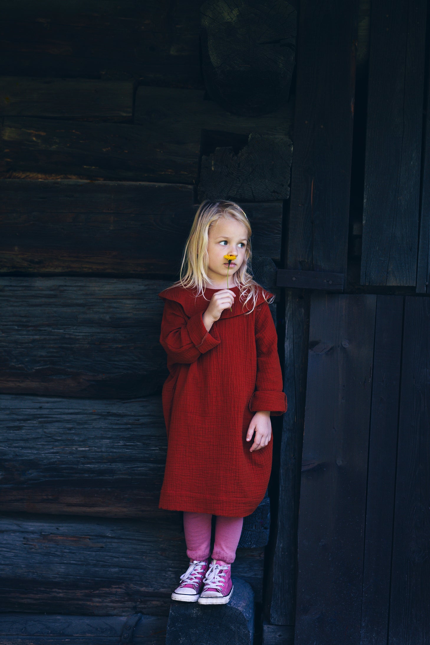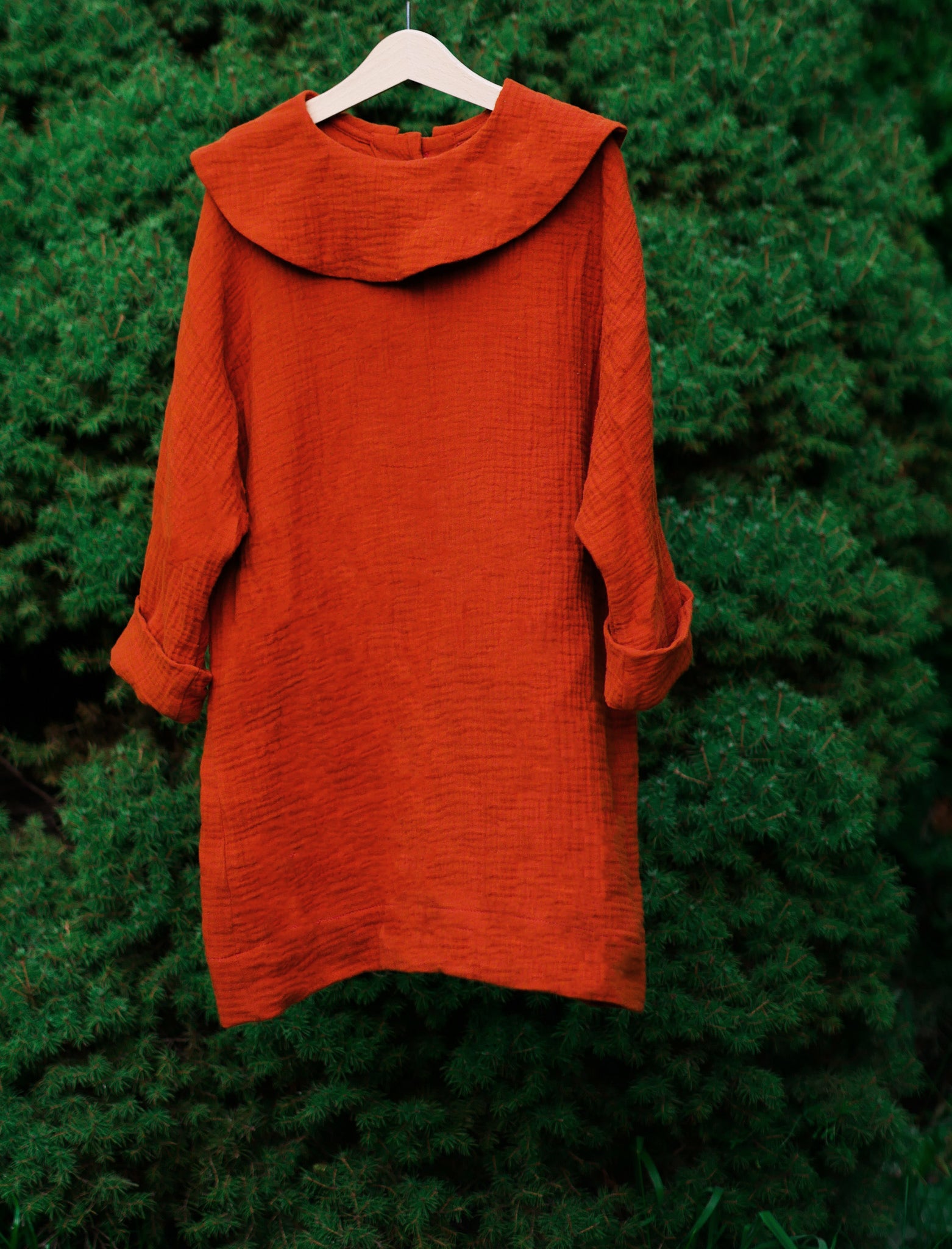 sukienka z długim rękawem z dużym, okrągłym kołnierzem. Zapinana na drewniane guziczki na plecach. Uszyta z miękkiego muślinu. Dostępna w 2 kolorach: karmelowym i różowym.