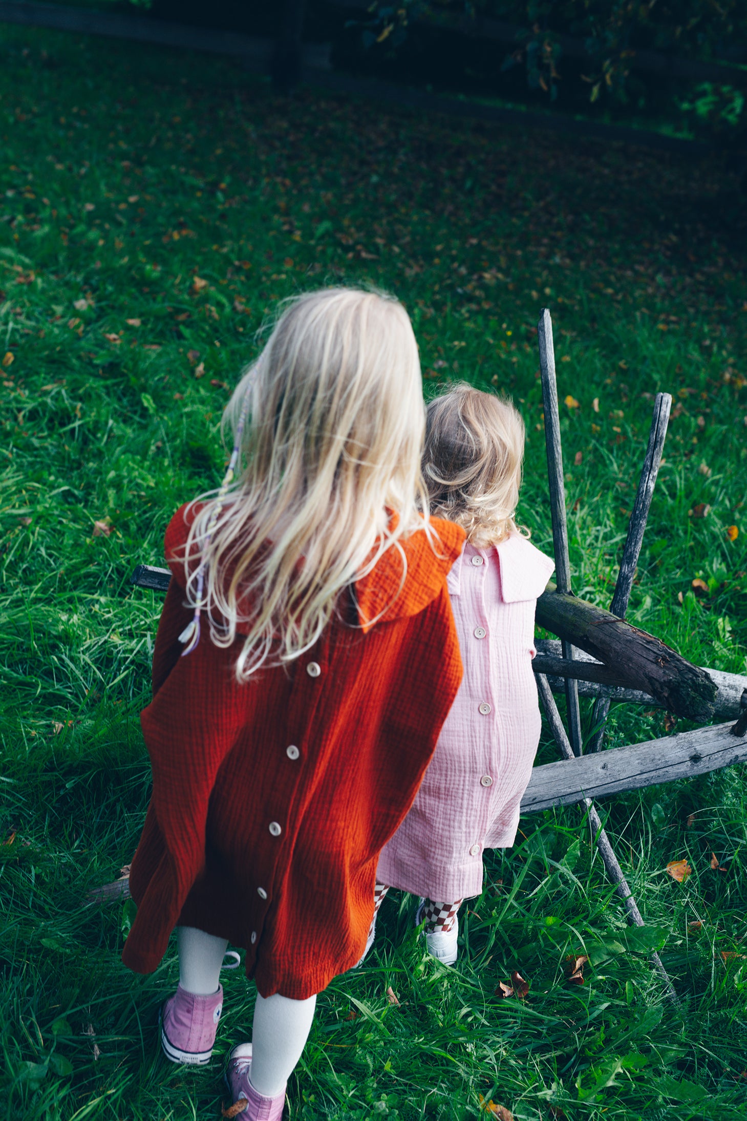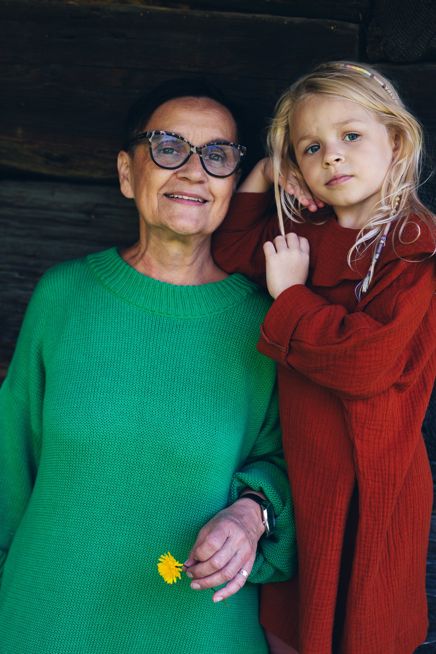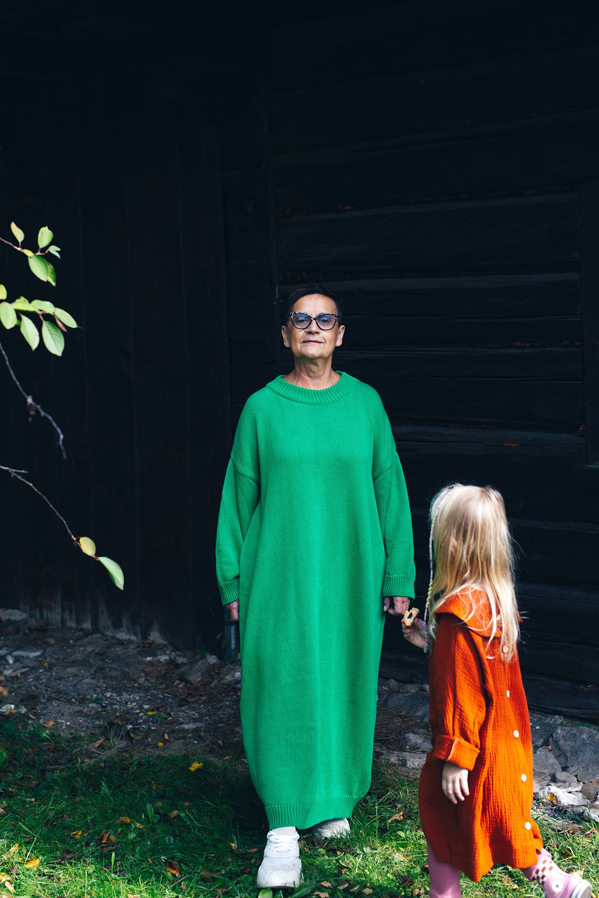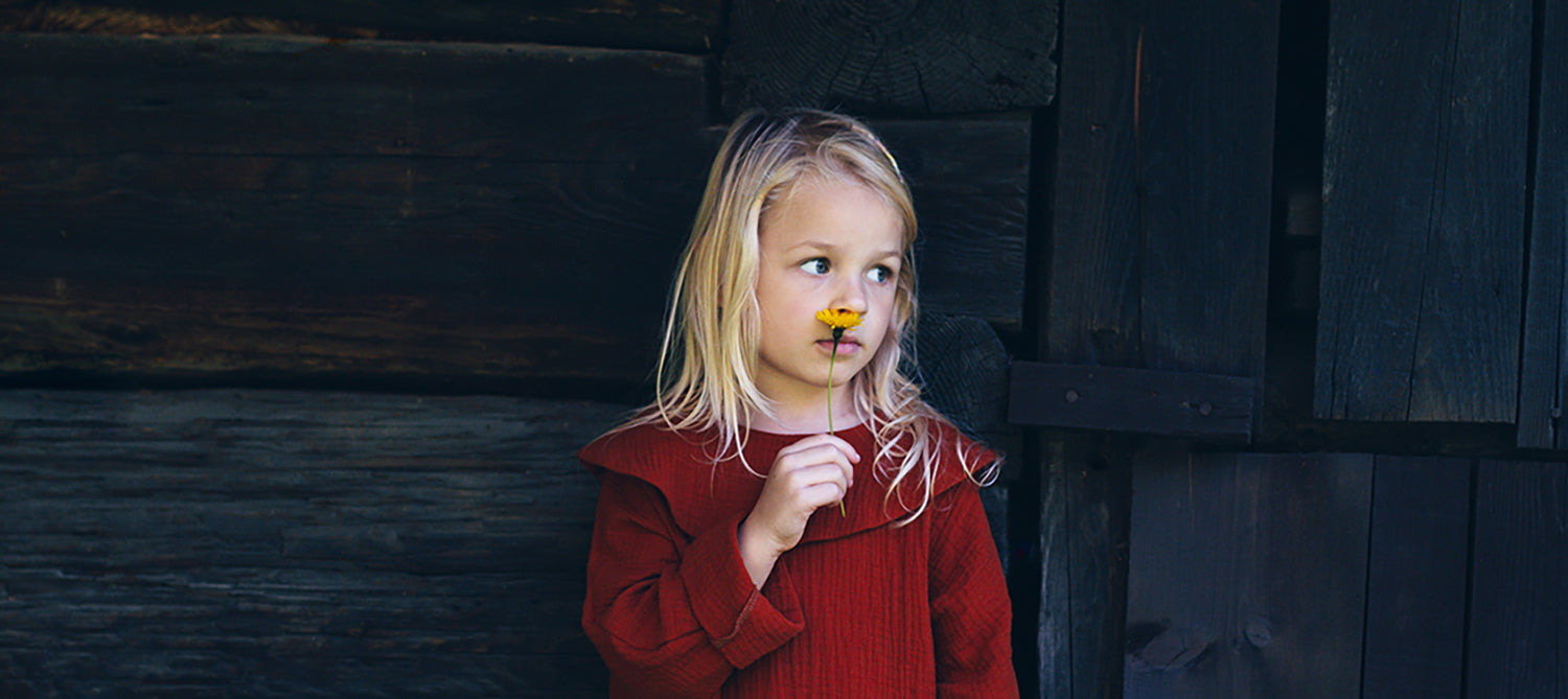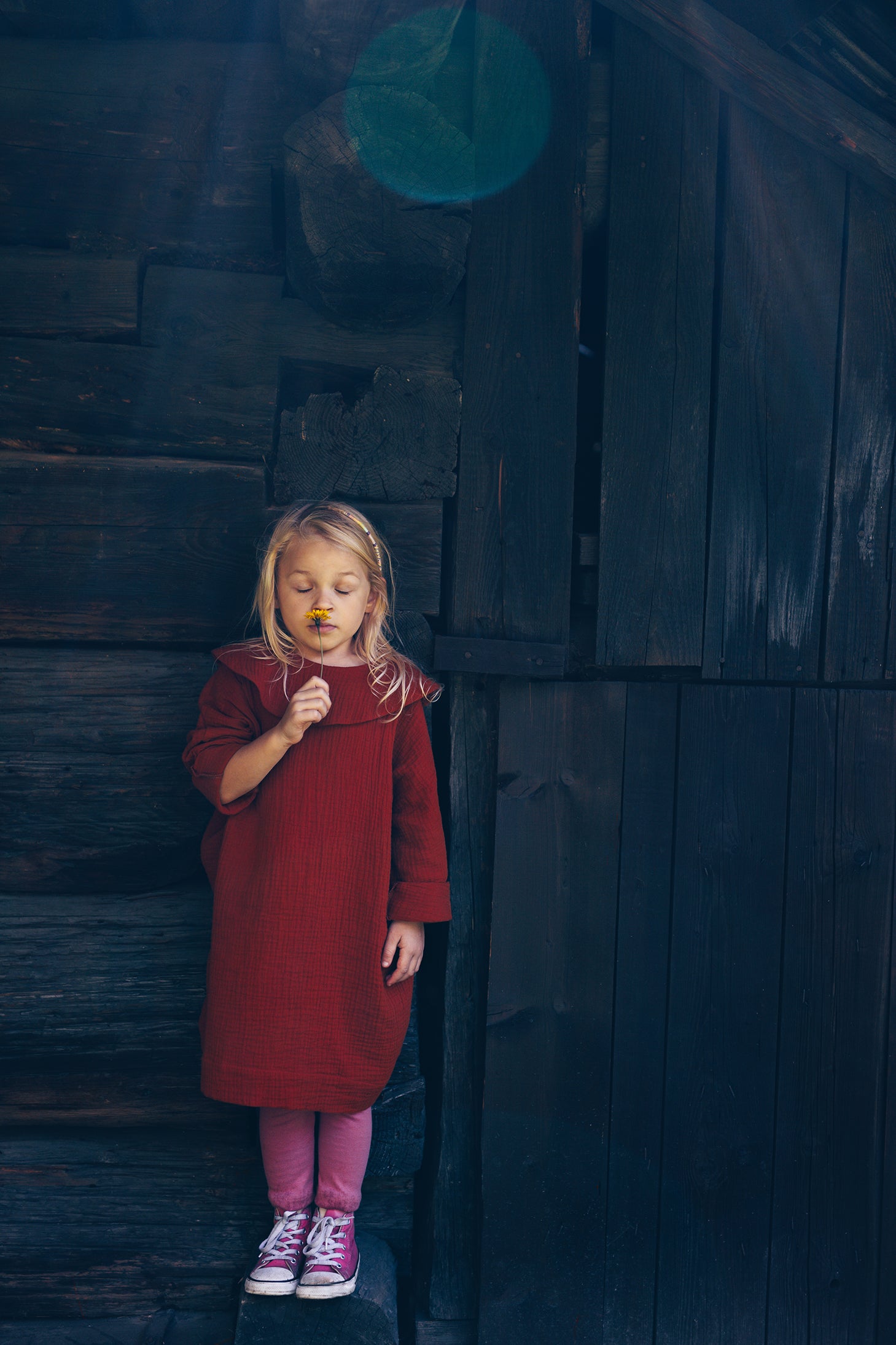 sukienka z długim rękawem z dużym, okrągłym kołnierzem. Zapinana na drewniane guziczki na plecach. Uszyta z miękkiego muślinu. Dostępna w 2 kolorach: karmelowym i różowym.