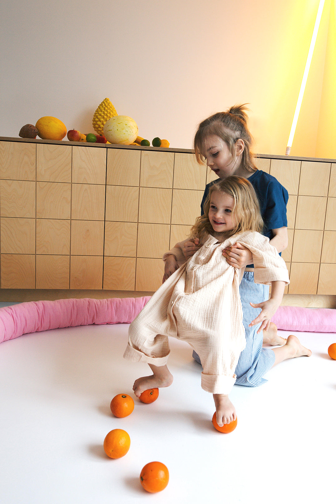 wygodny, przewiewny kombinezon uszyty z miękkiego muślinu zapinany na drewniane guziczki. dostępny w kolorach: różowym, ecru, żółtym.