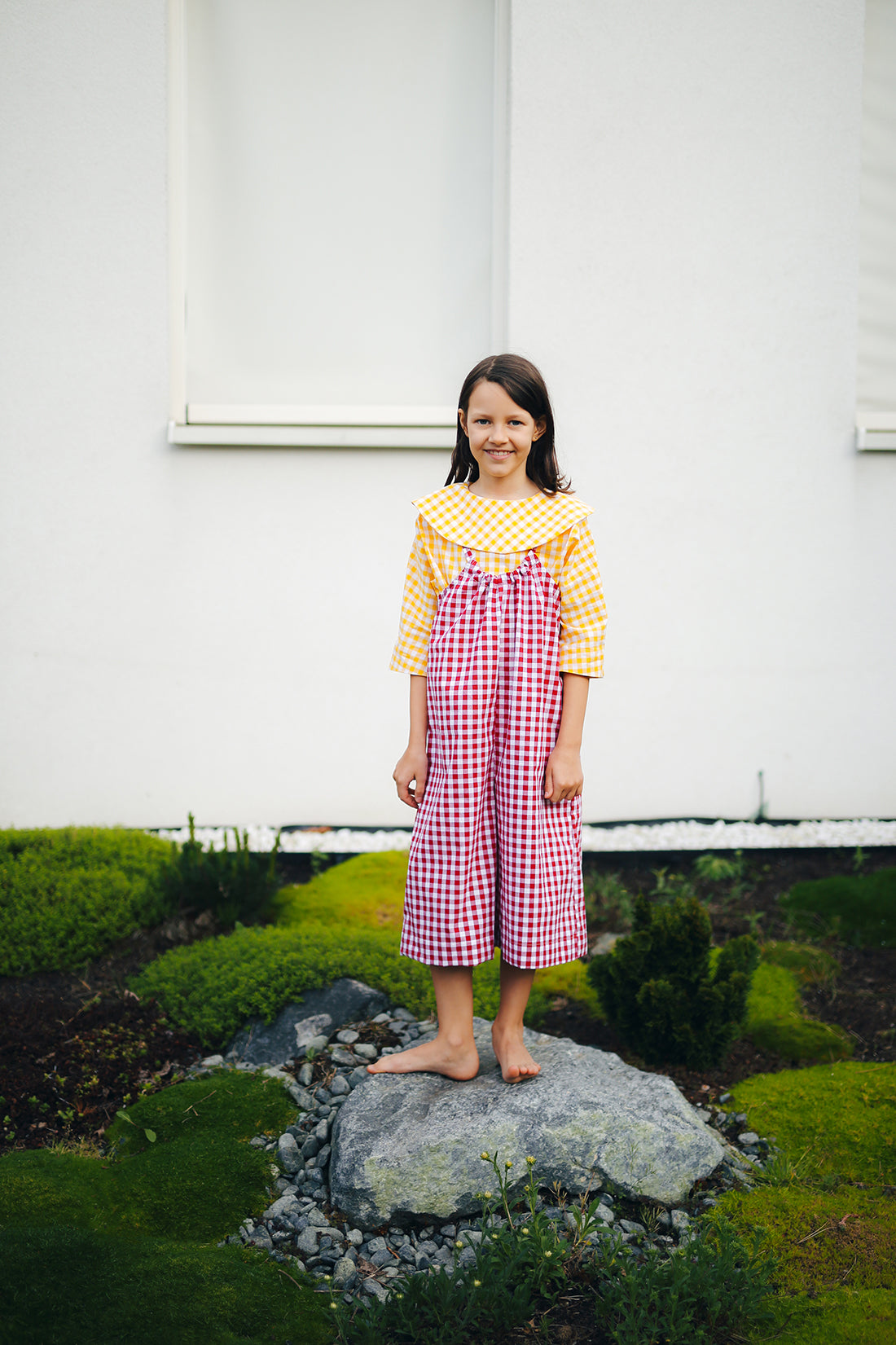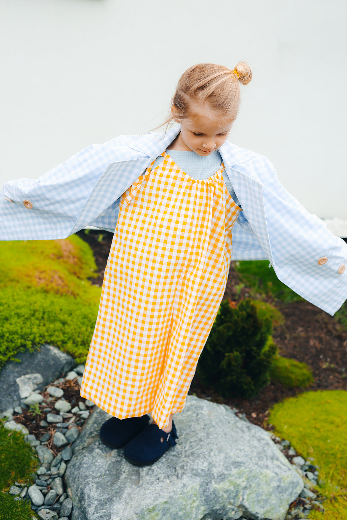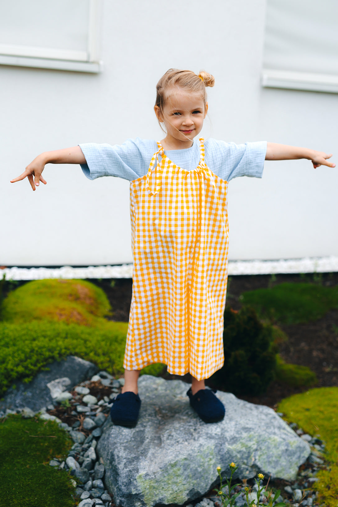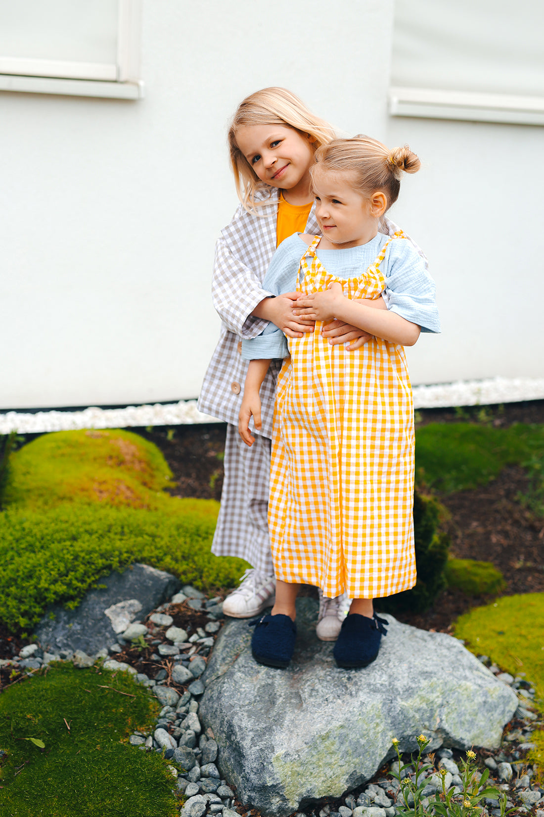 kombinezon z regulowanymi ramiączkami z szerokimi nogawkami, uszyty z popeliny w biało-żółtą kratkę.