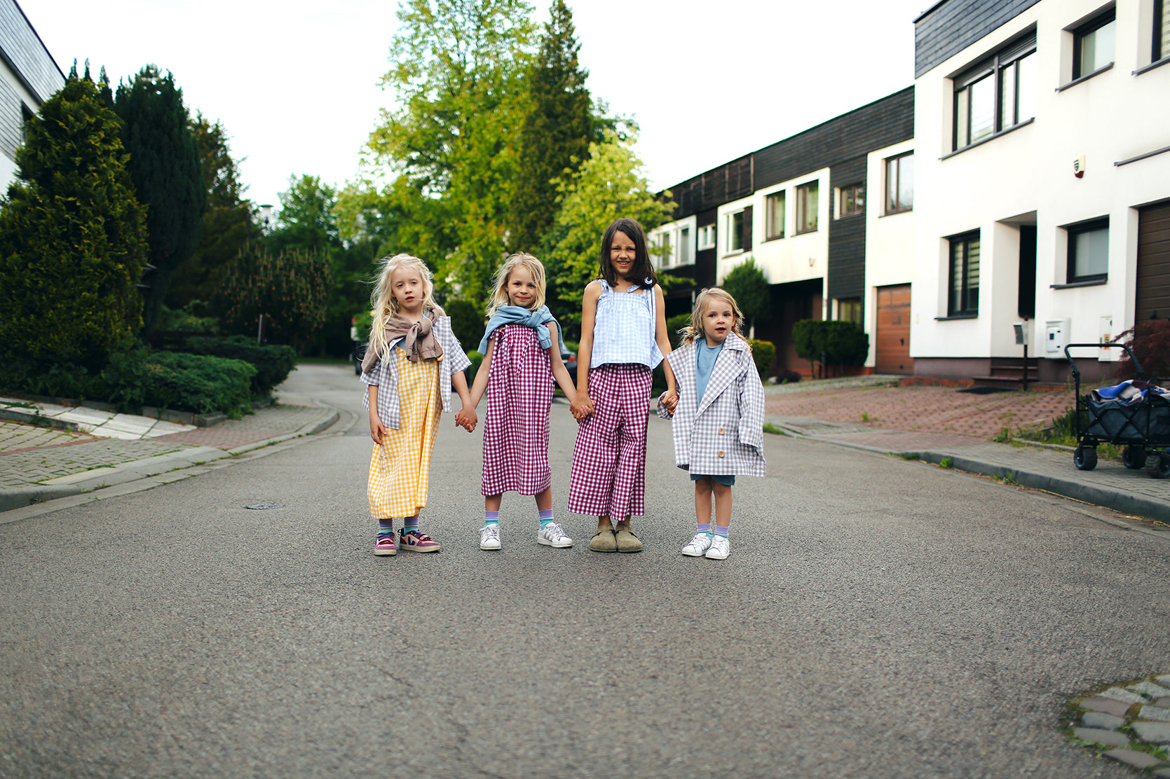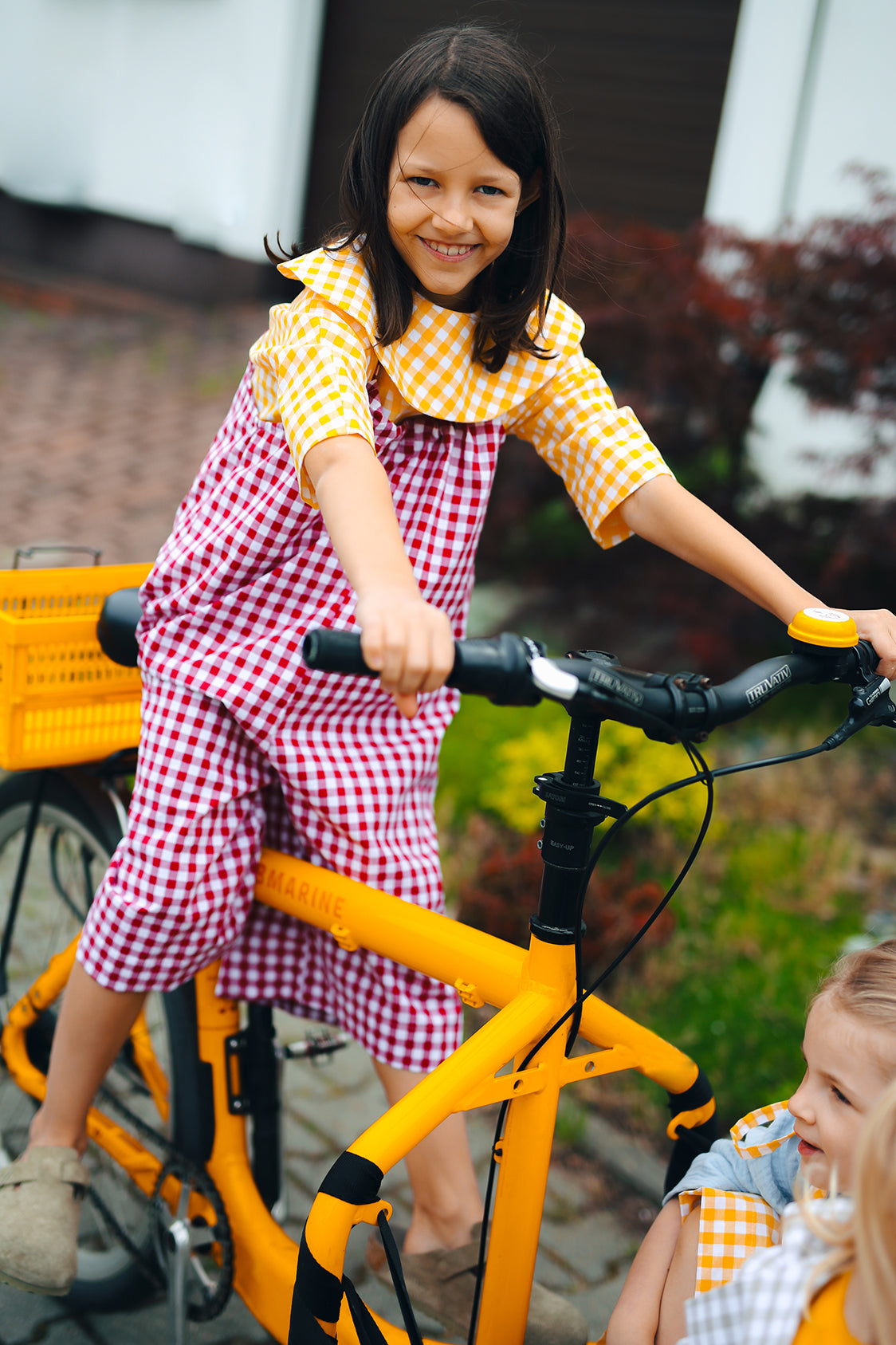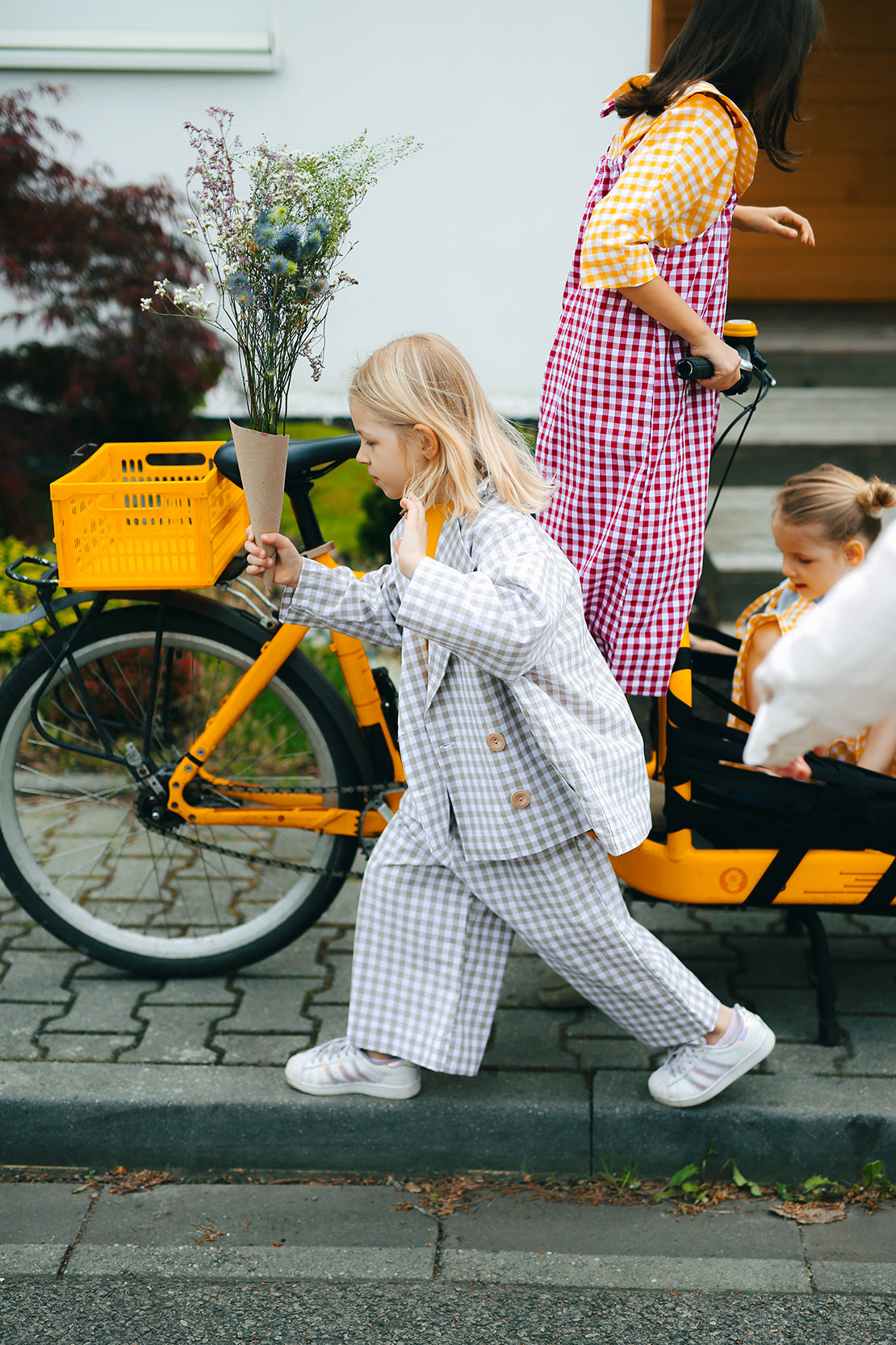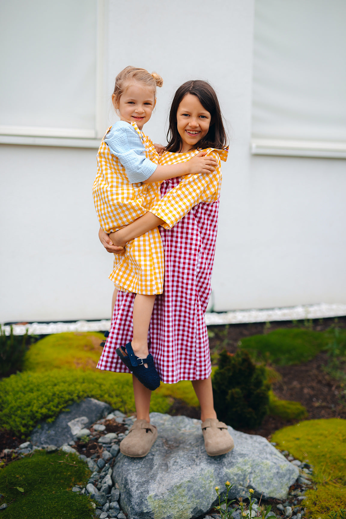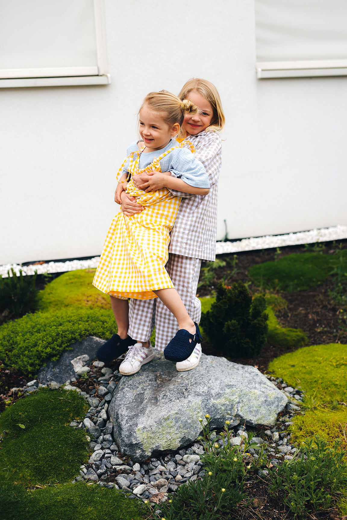kombinezon z regulowanymi ramiączkami z szerokimi nogawkami, uszyty z popeliny w biało-żółtą kratkę.