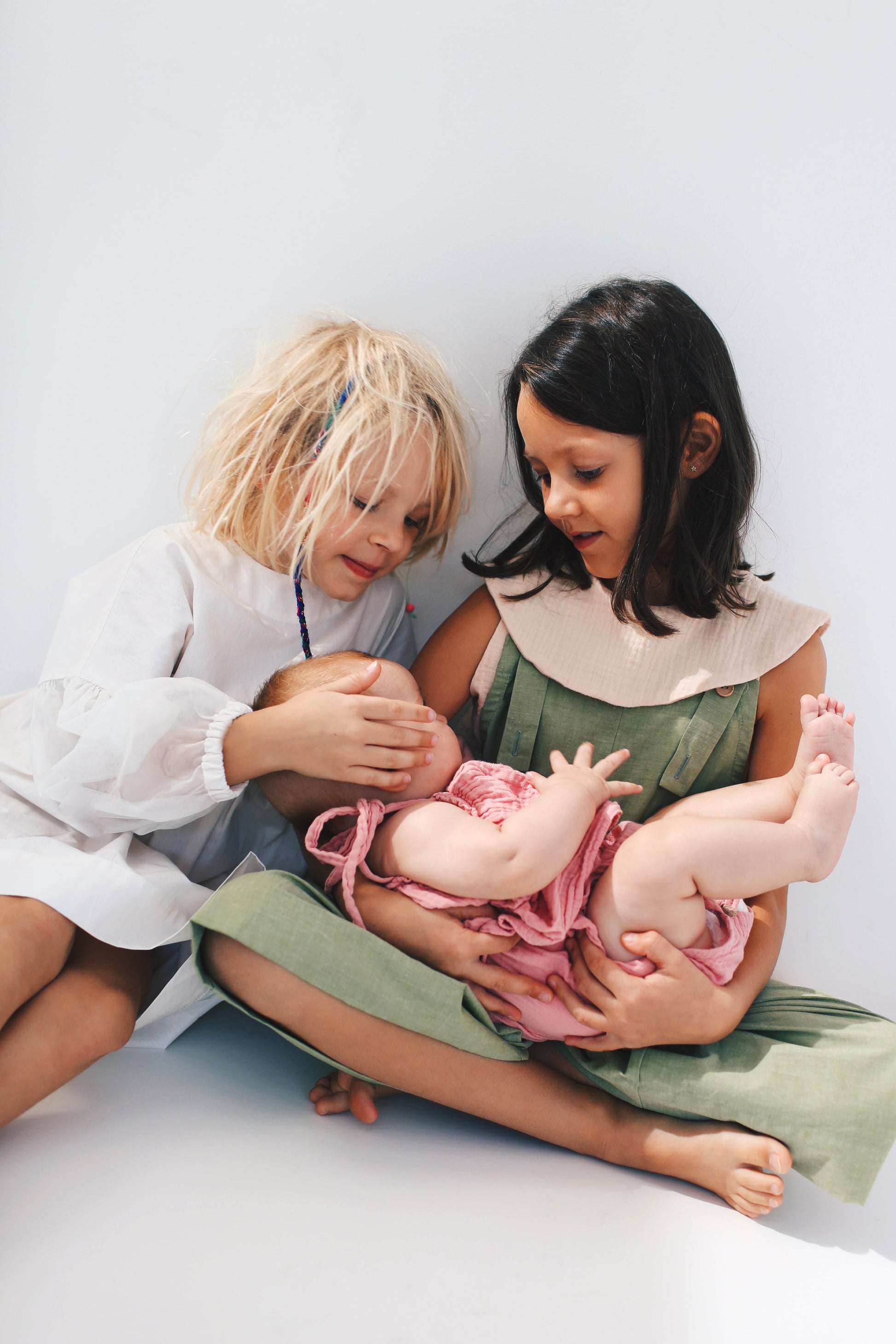 bluzka bez rękawów z dużym, okrągłym kołnierzem. Uszyta z miękkiego muślinu w kolorze różowym. świetnie komponuje się z naszymi ogrodniczkami, spódnicami, spodenkami.