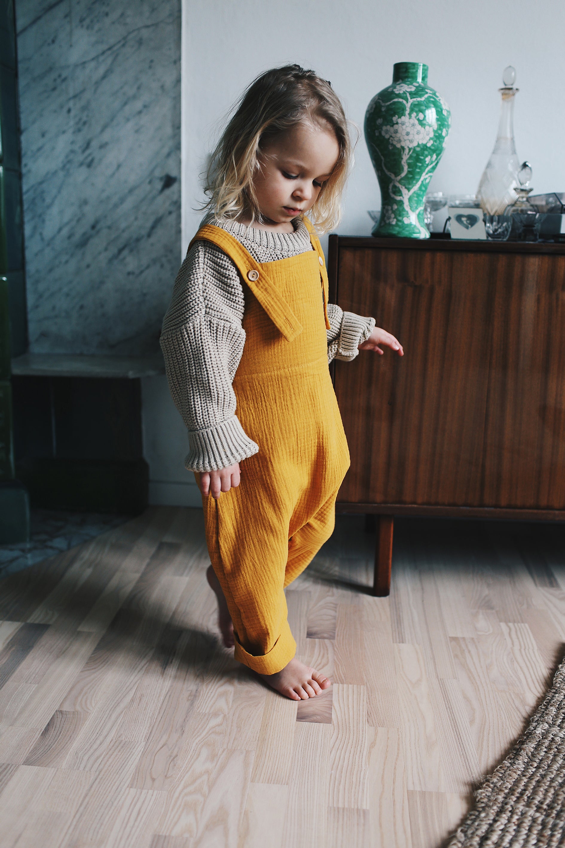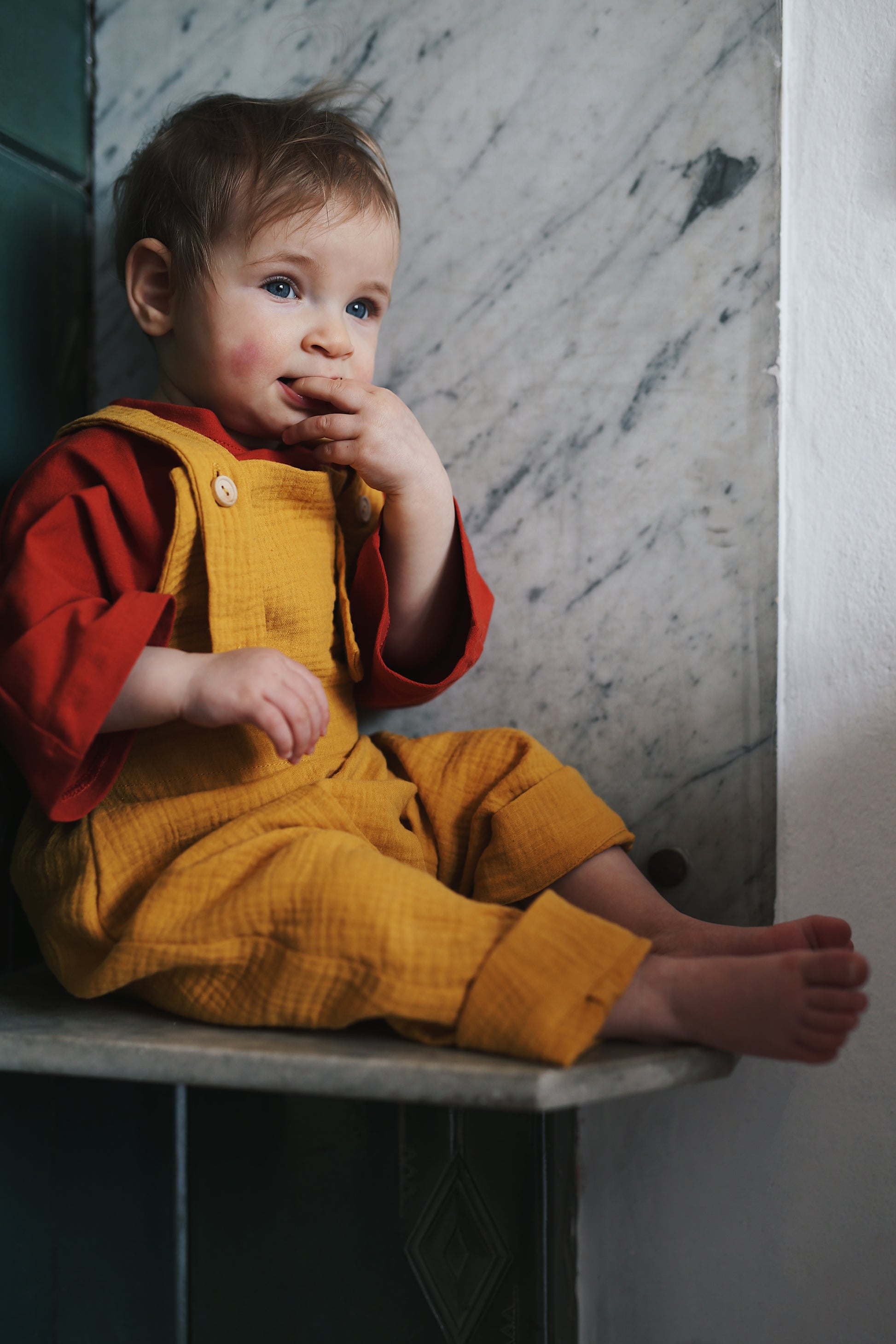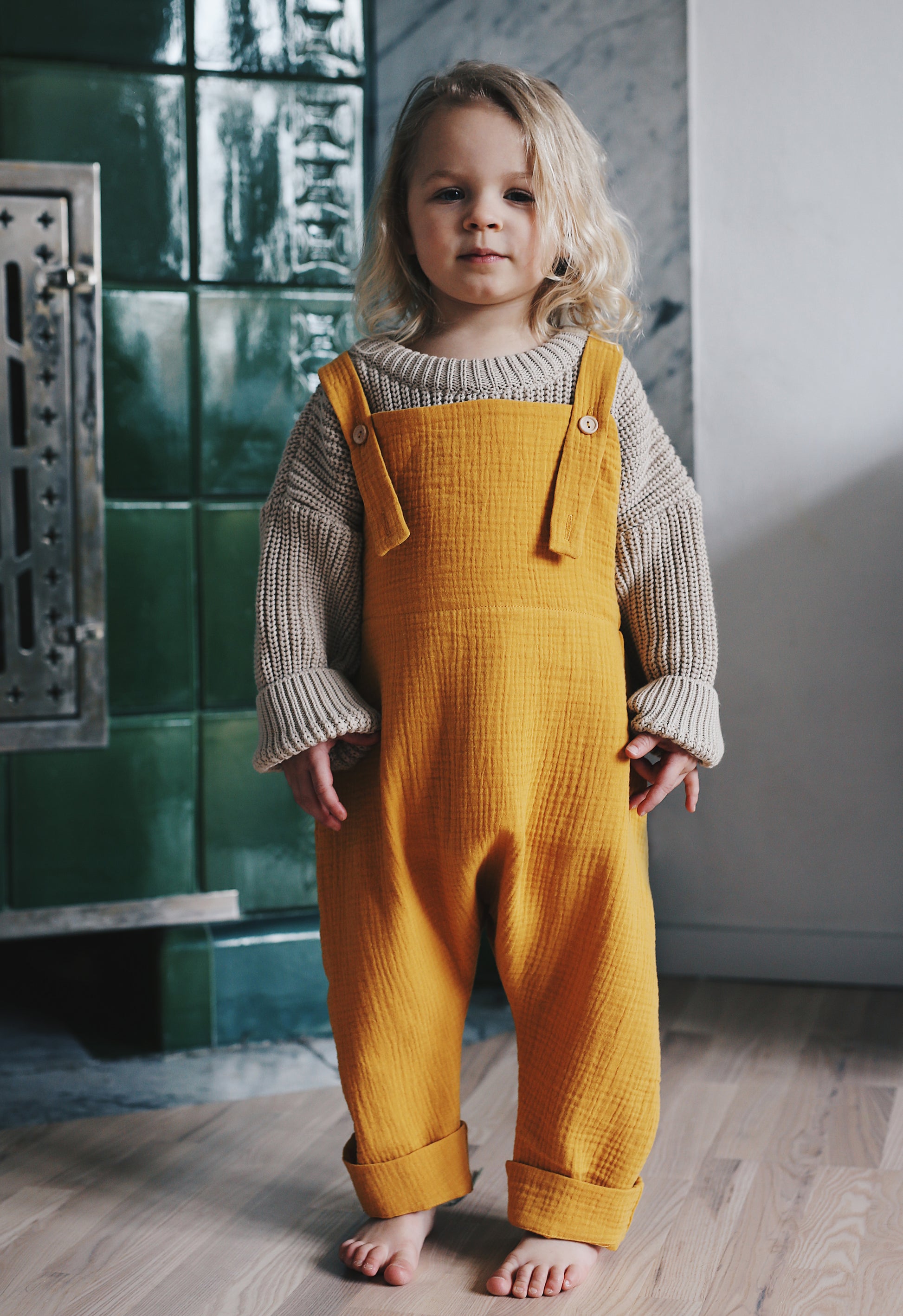 wygodne, przewiewne ogrodniczki z regulowanymi ramiączkami, uszyte z mięciutkiego, podwójnego muślinu tkanego z bawełny organicznej. świetnie pasują do cacanych muślinowych bluzeczek, sweterków i tshirtów. dostępne w słonecznej żółci.