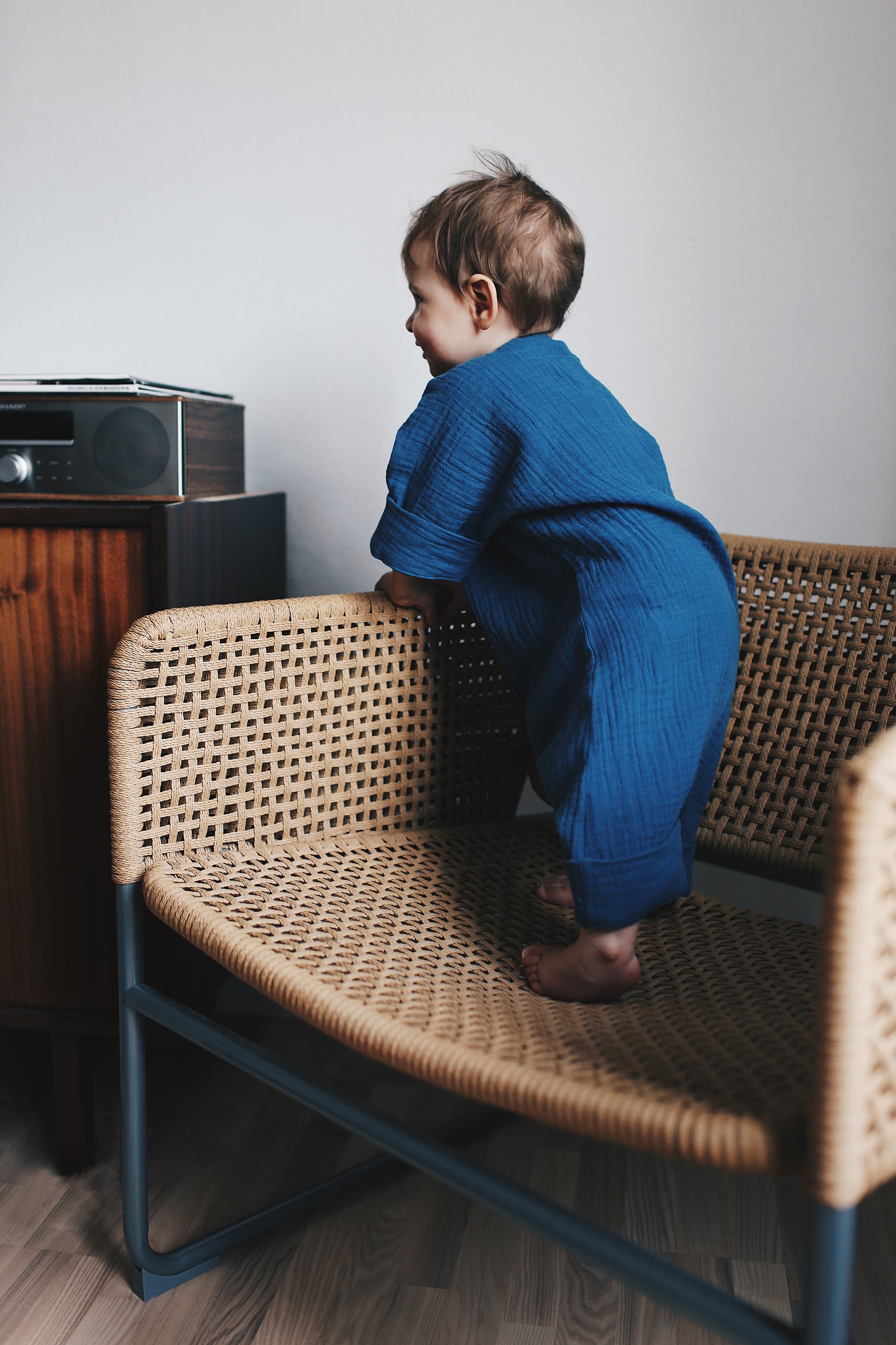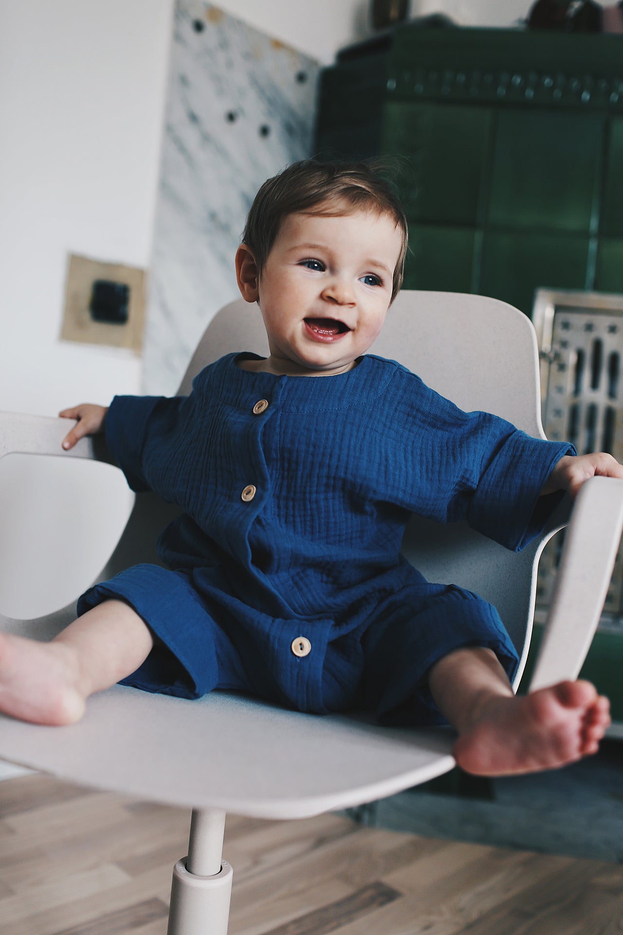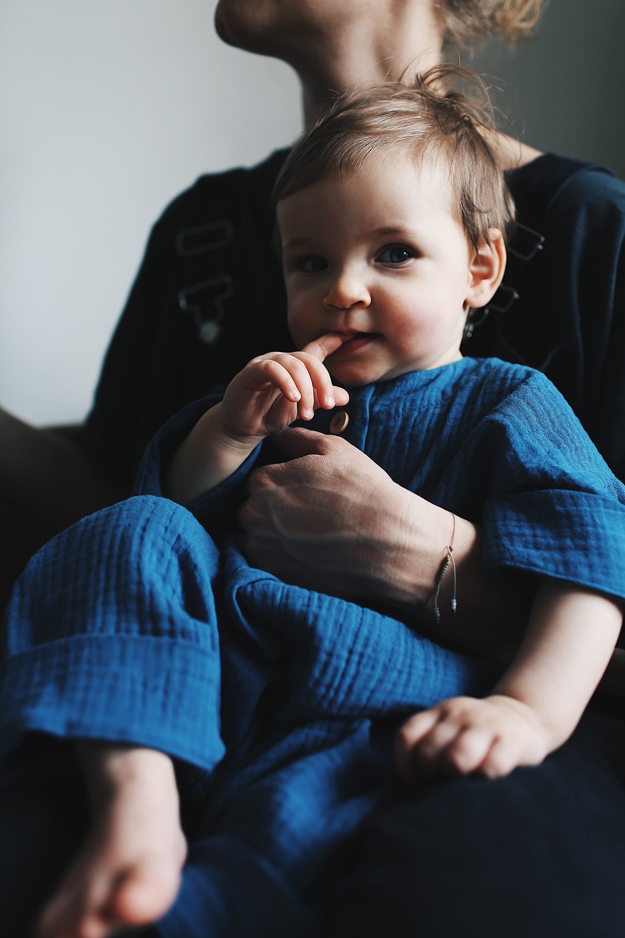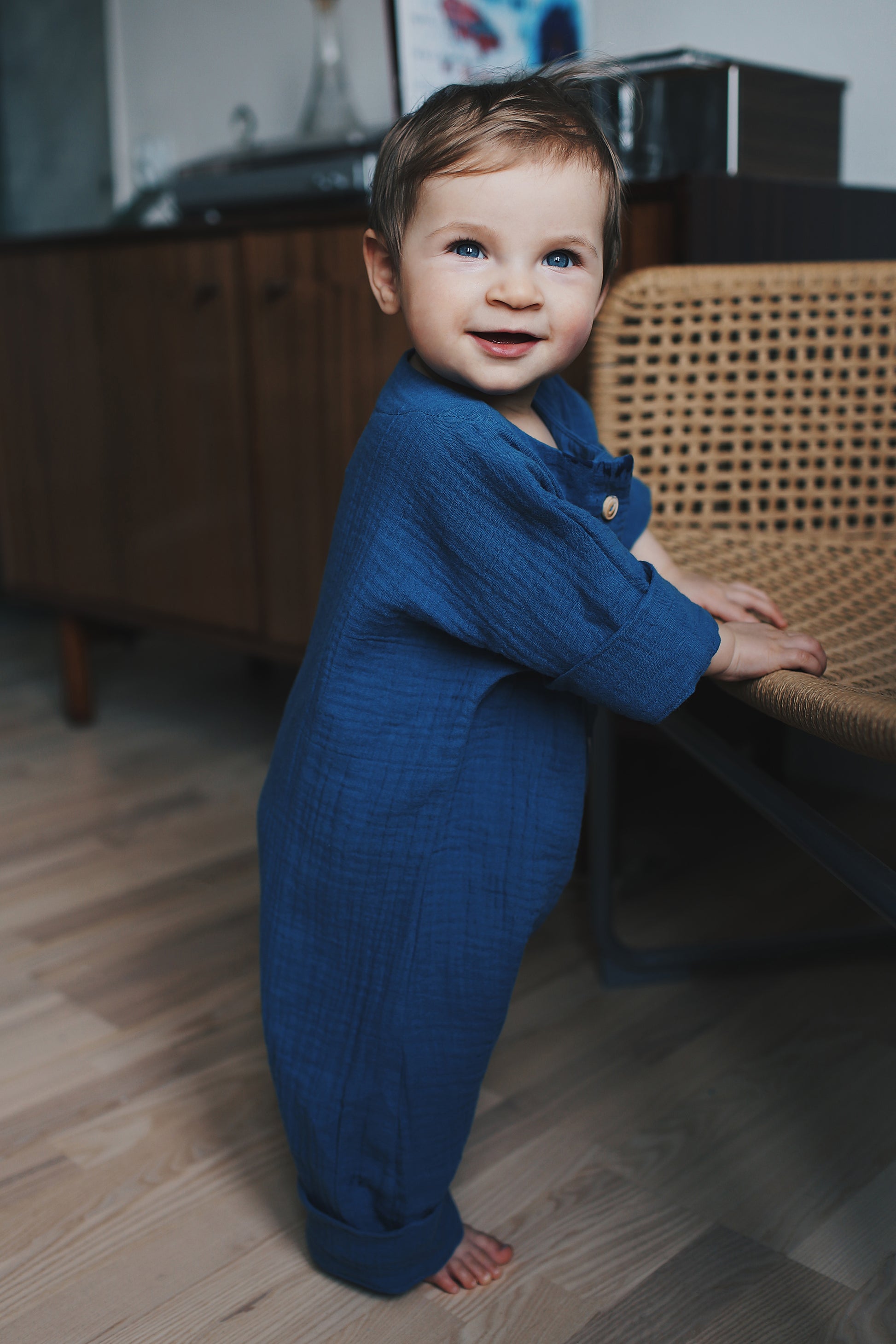 wygodny, przewiewny kombinezon uszyty z miękkiego muślinu zapinany na drewniane guziczki. dostępny w kolorach: żółtym i niebieskim