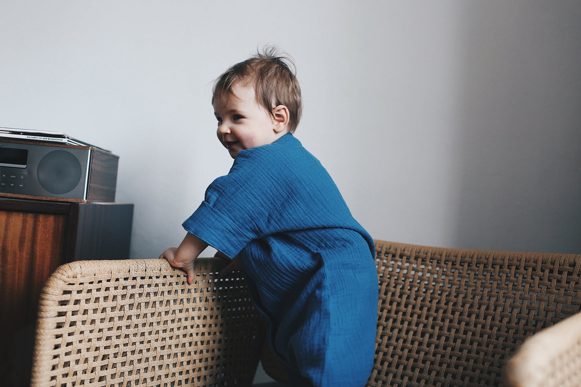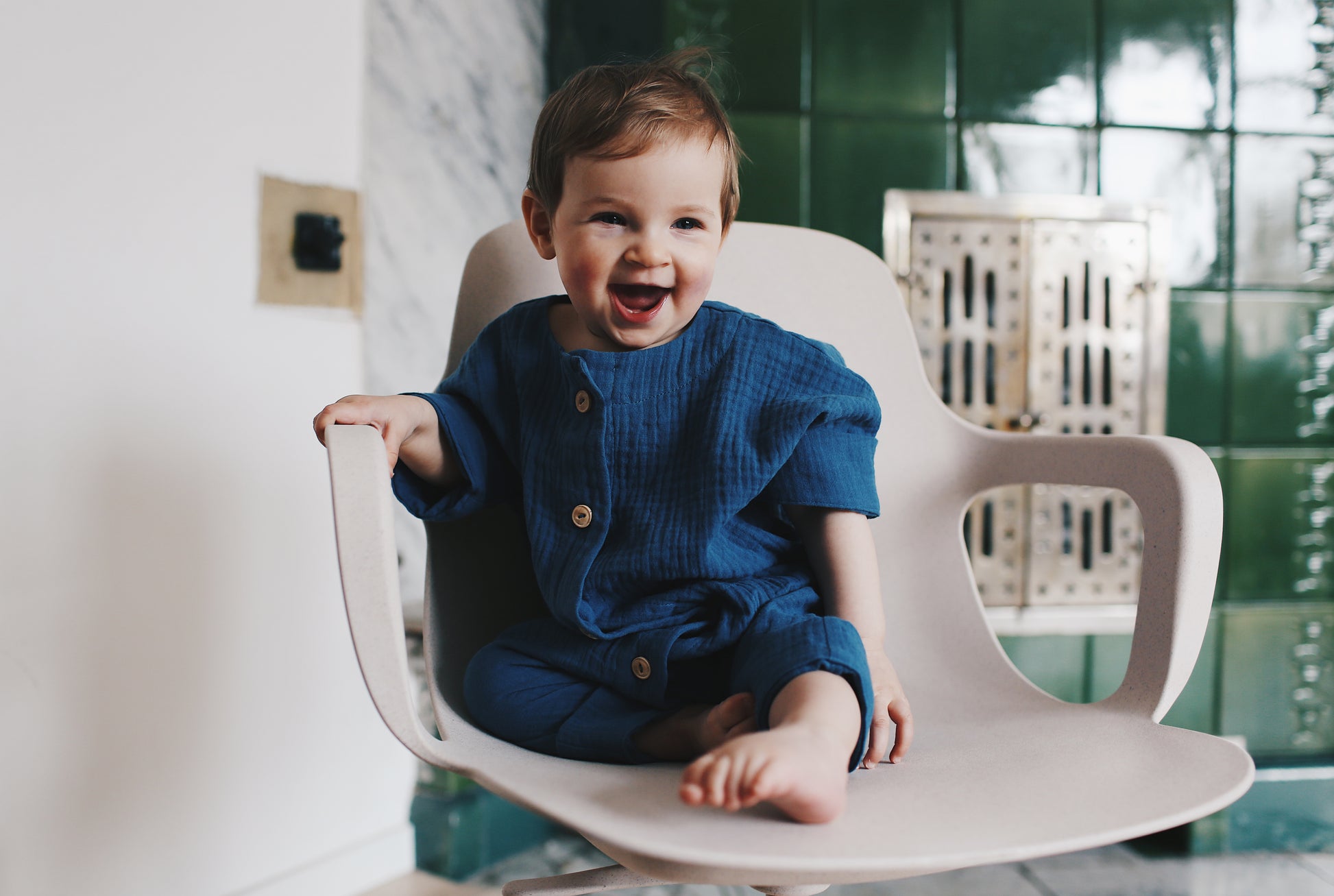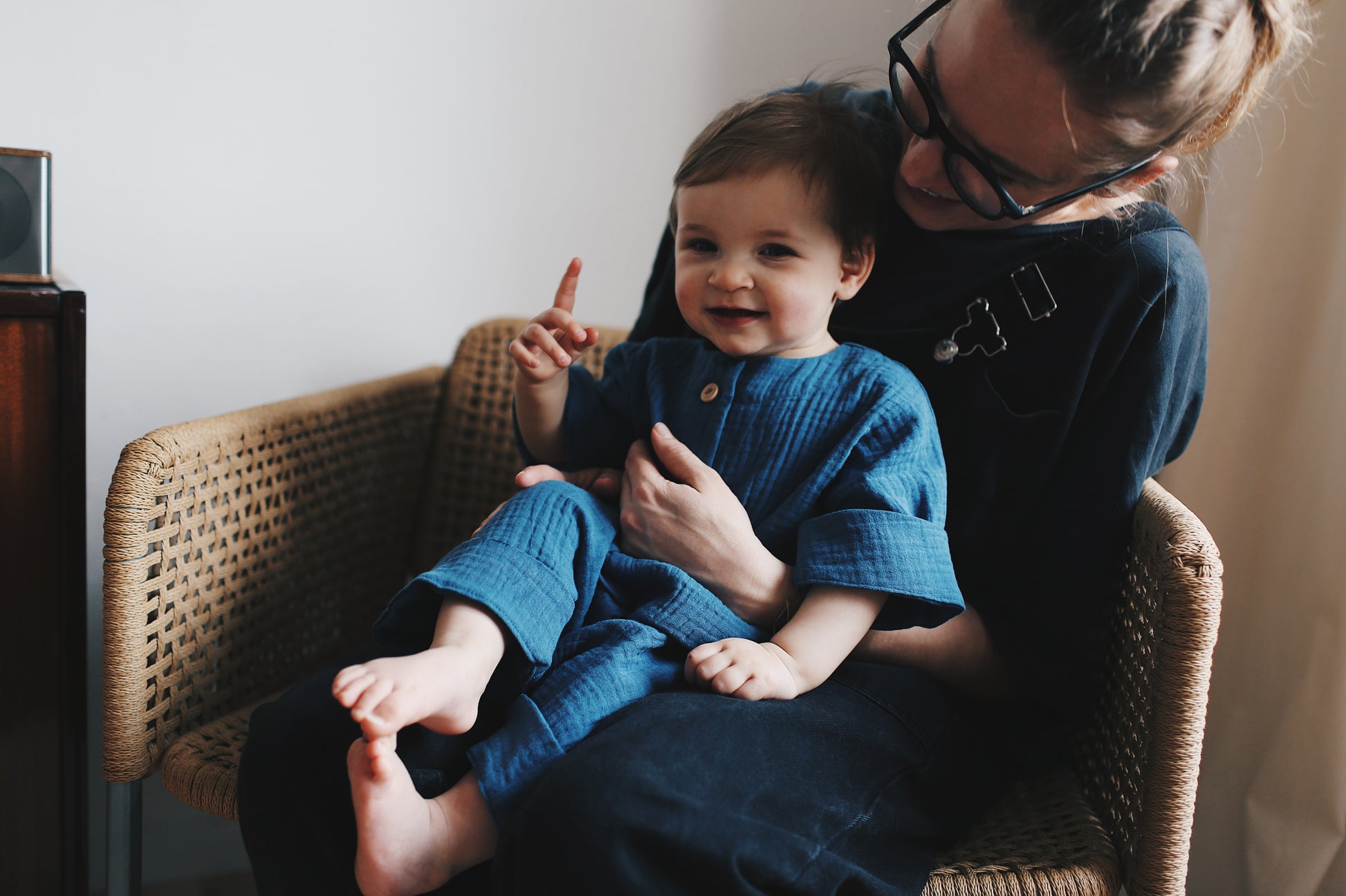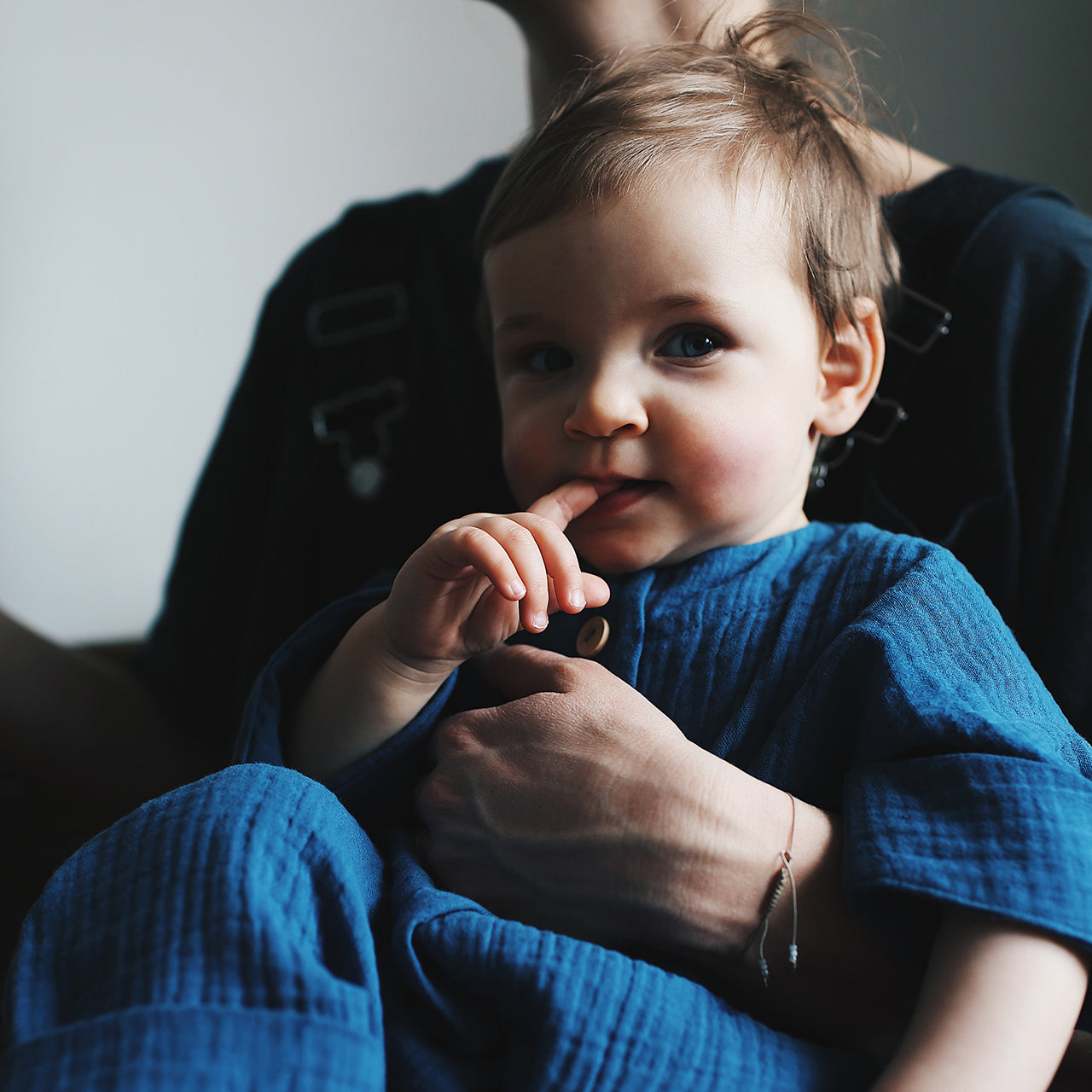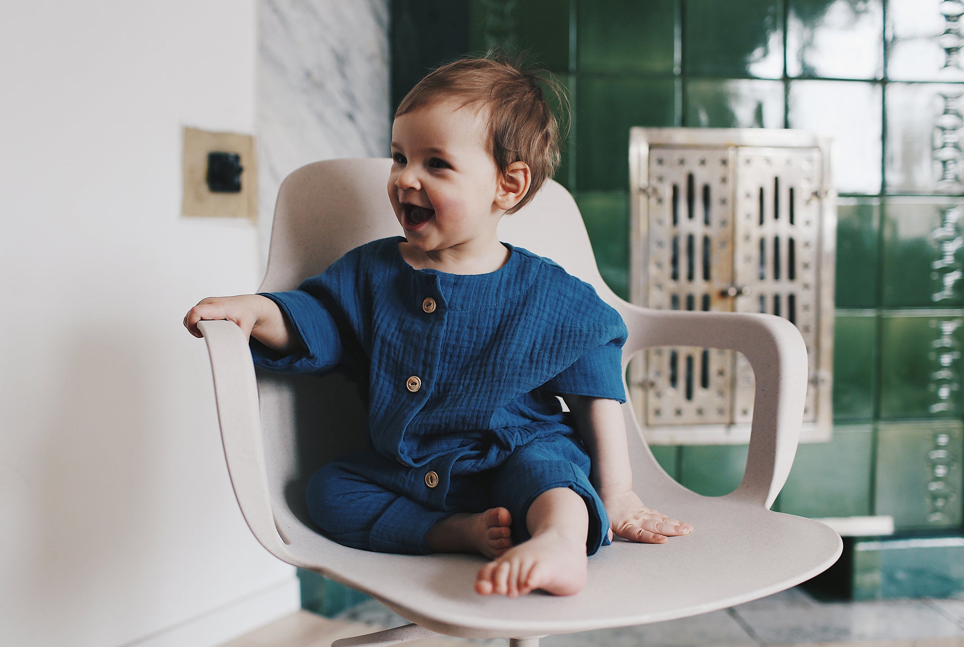 wygodny, przewiewny kombinezon uszyty z miękkiego muślinu zapinany na drewniane guziczki. dostępny w kolorach: żółtym i niebieskim