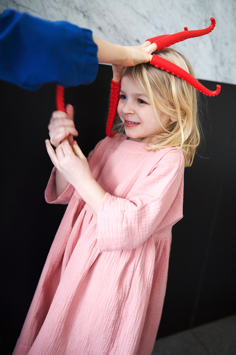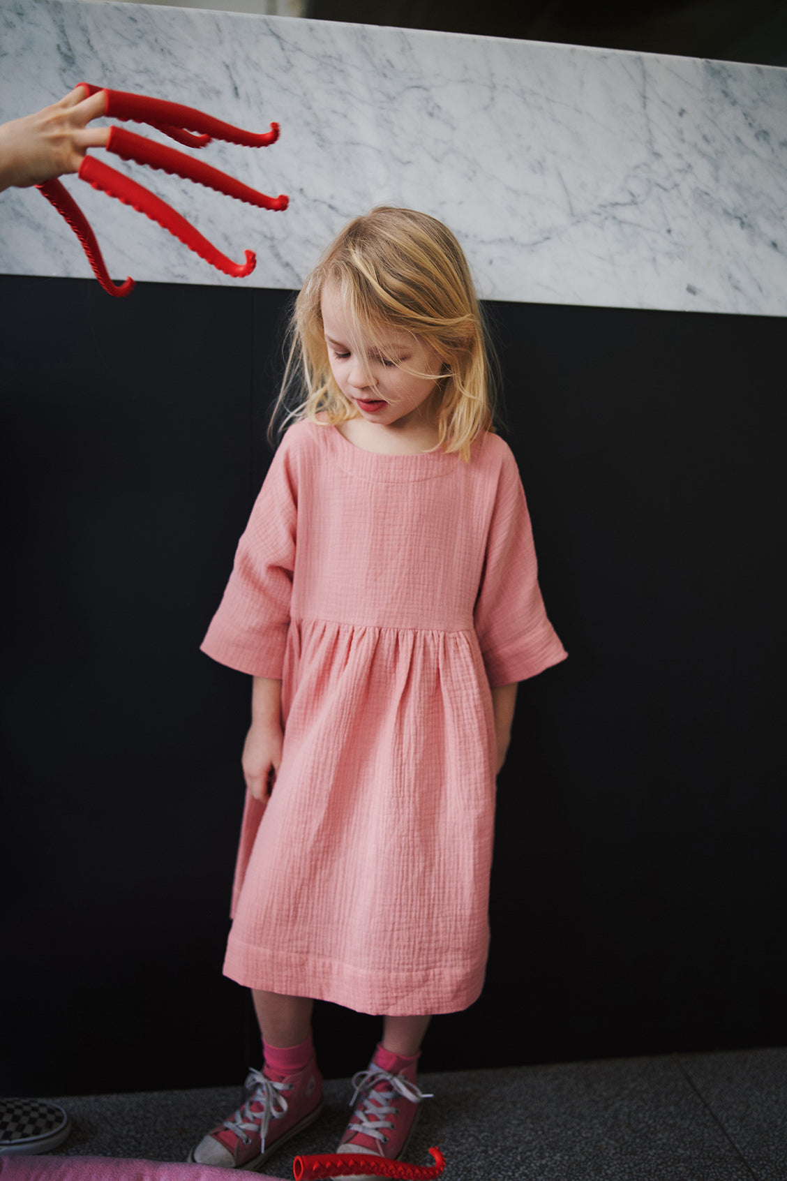 urocza sukienka z guziczkami na plecach uszyta z miękkiego, przewiewnego muślinu w kolorze różowym.