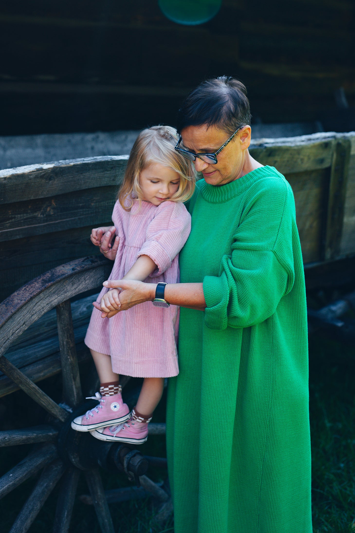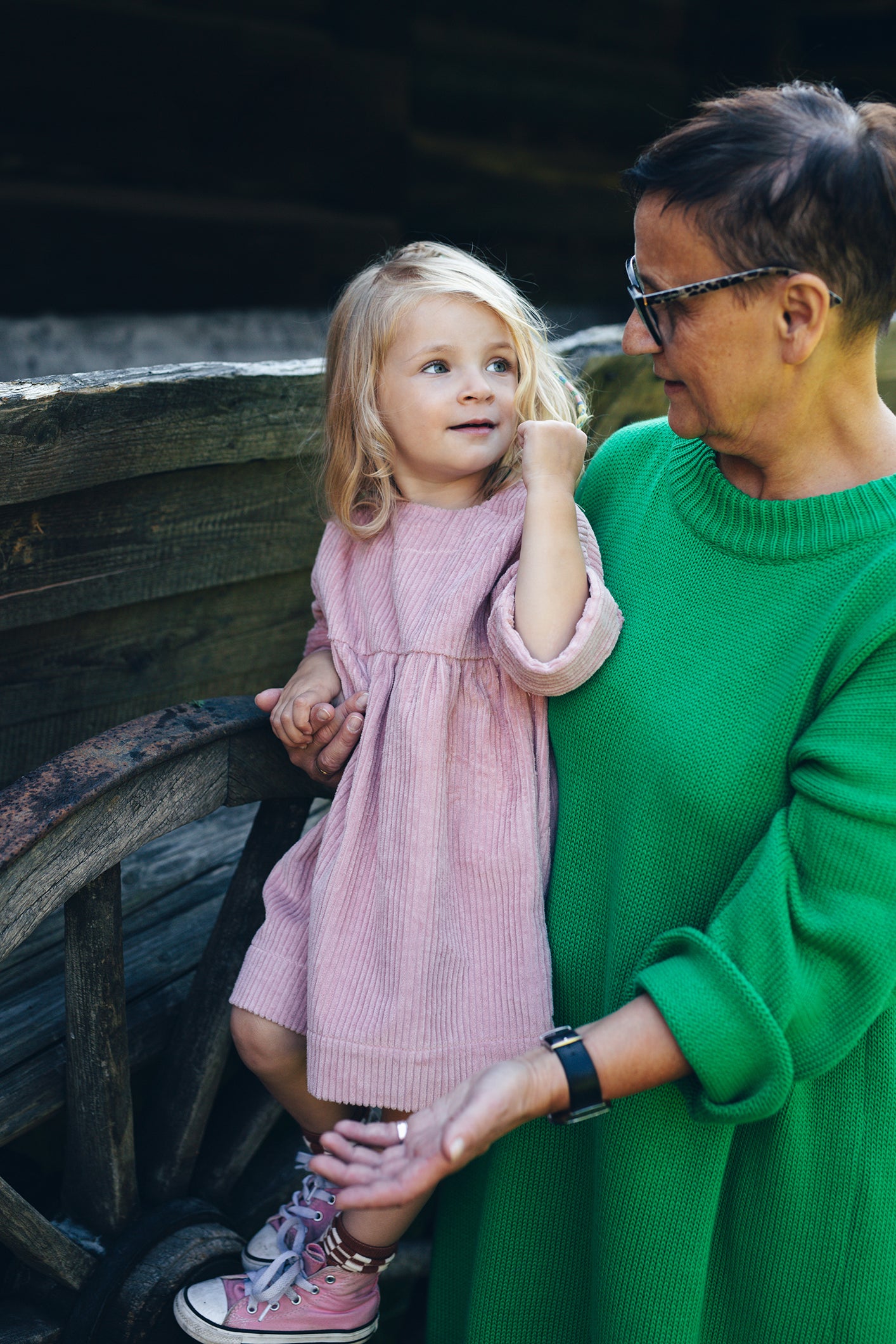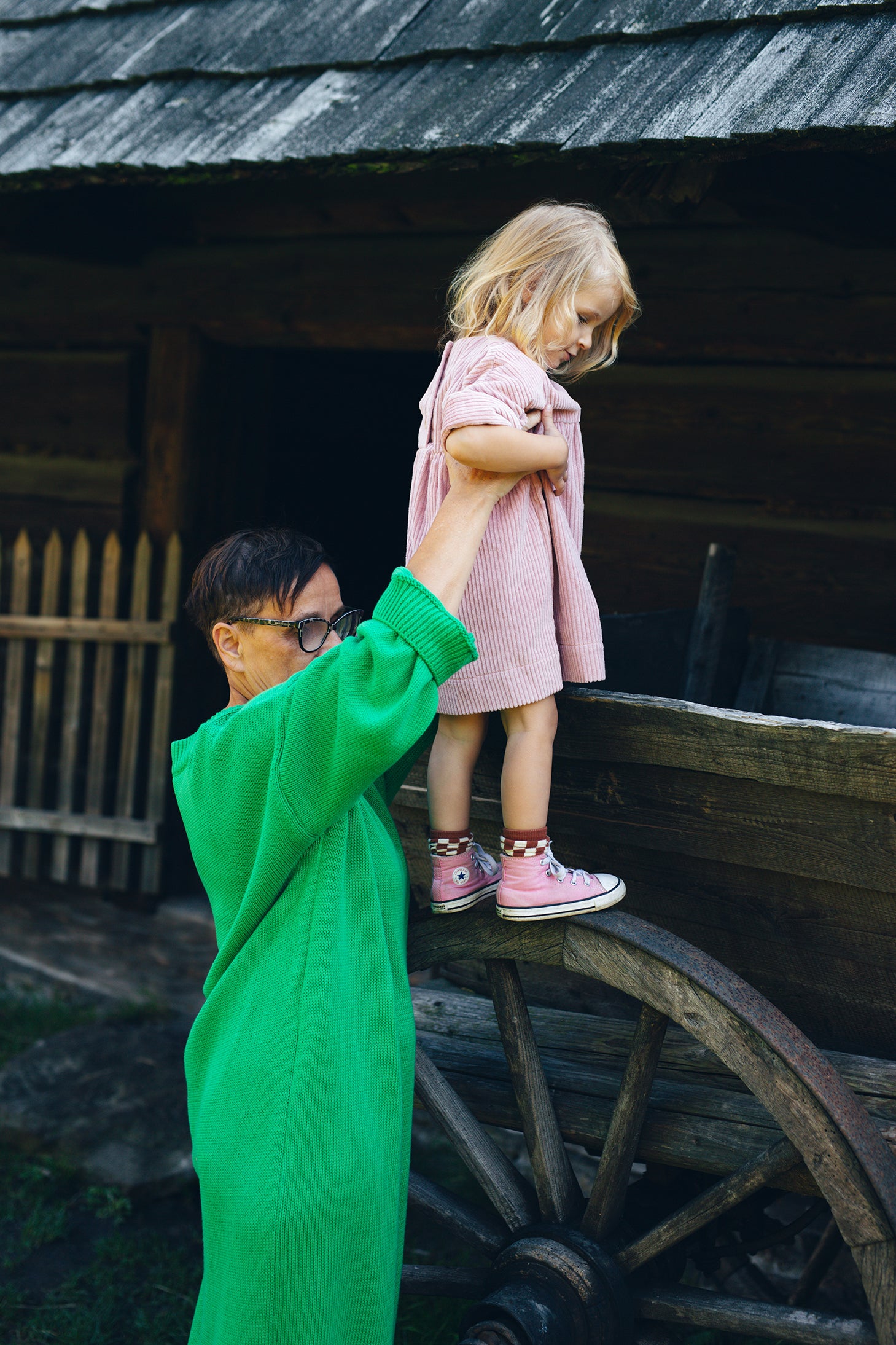 sukienka z guziczkami na plecach z rękawem 3/4 uszyta z miękkiego sztruksu o grubym prążku.