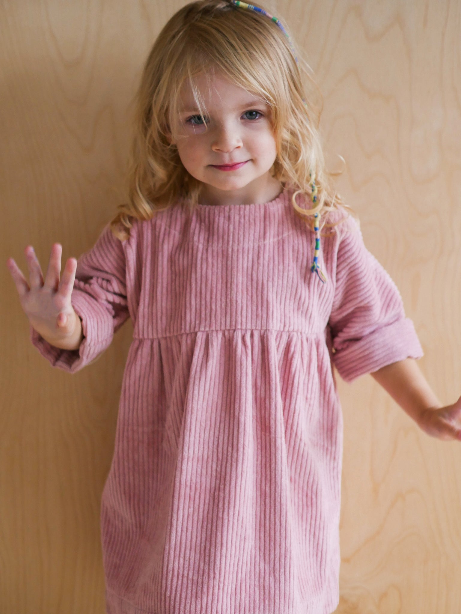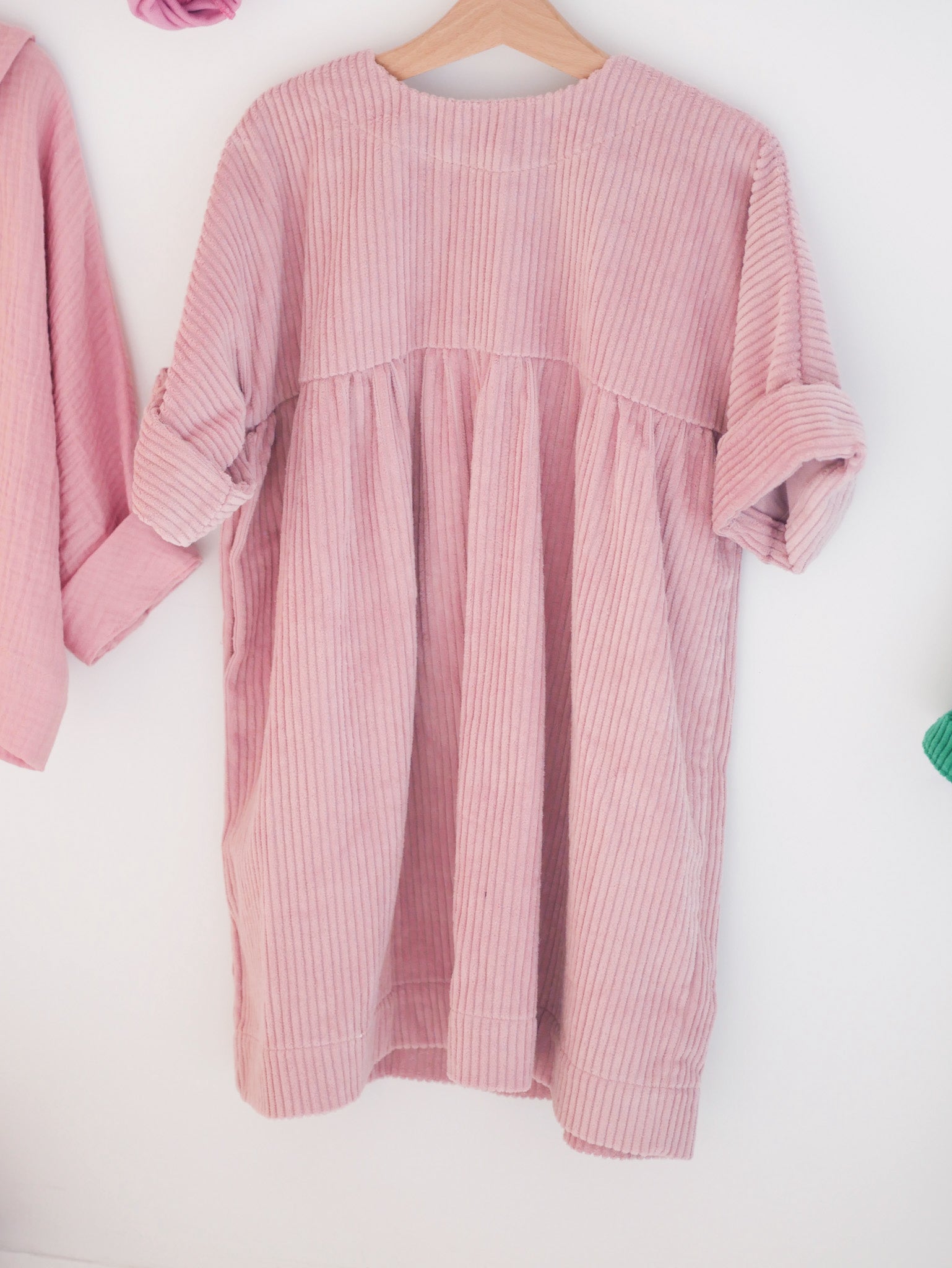 różowa, sztruksowa sukienka z guziczkami na plecach