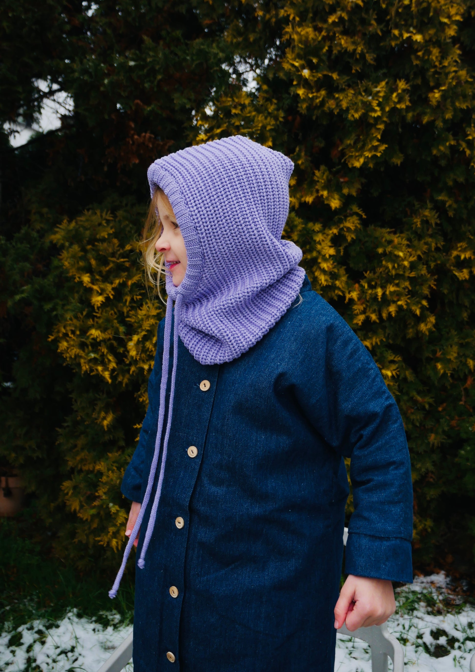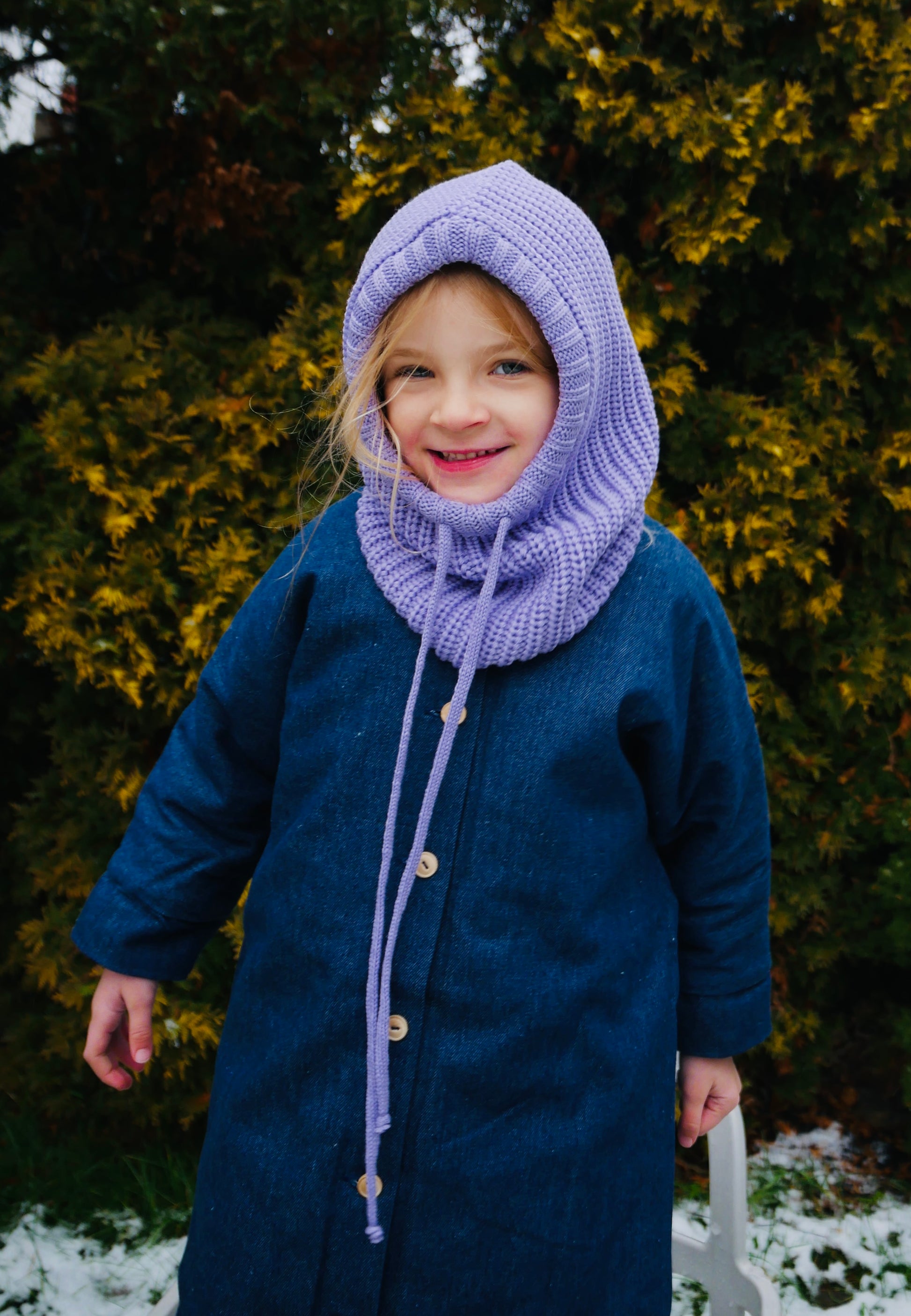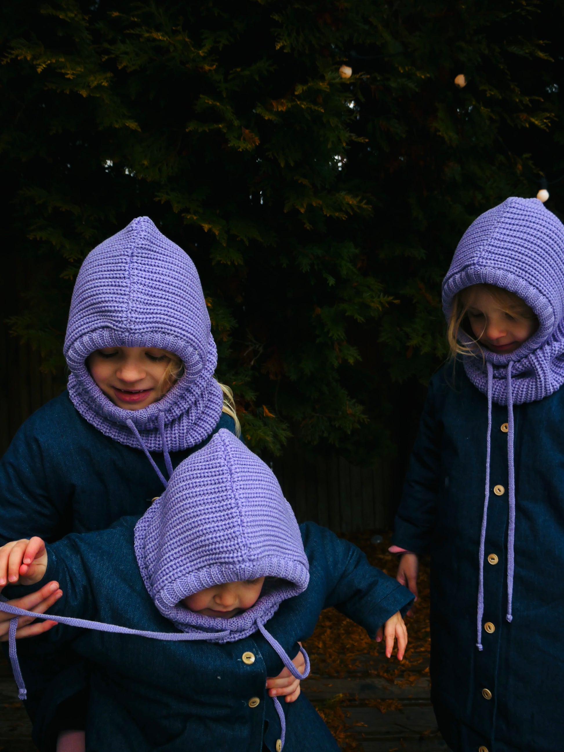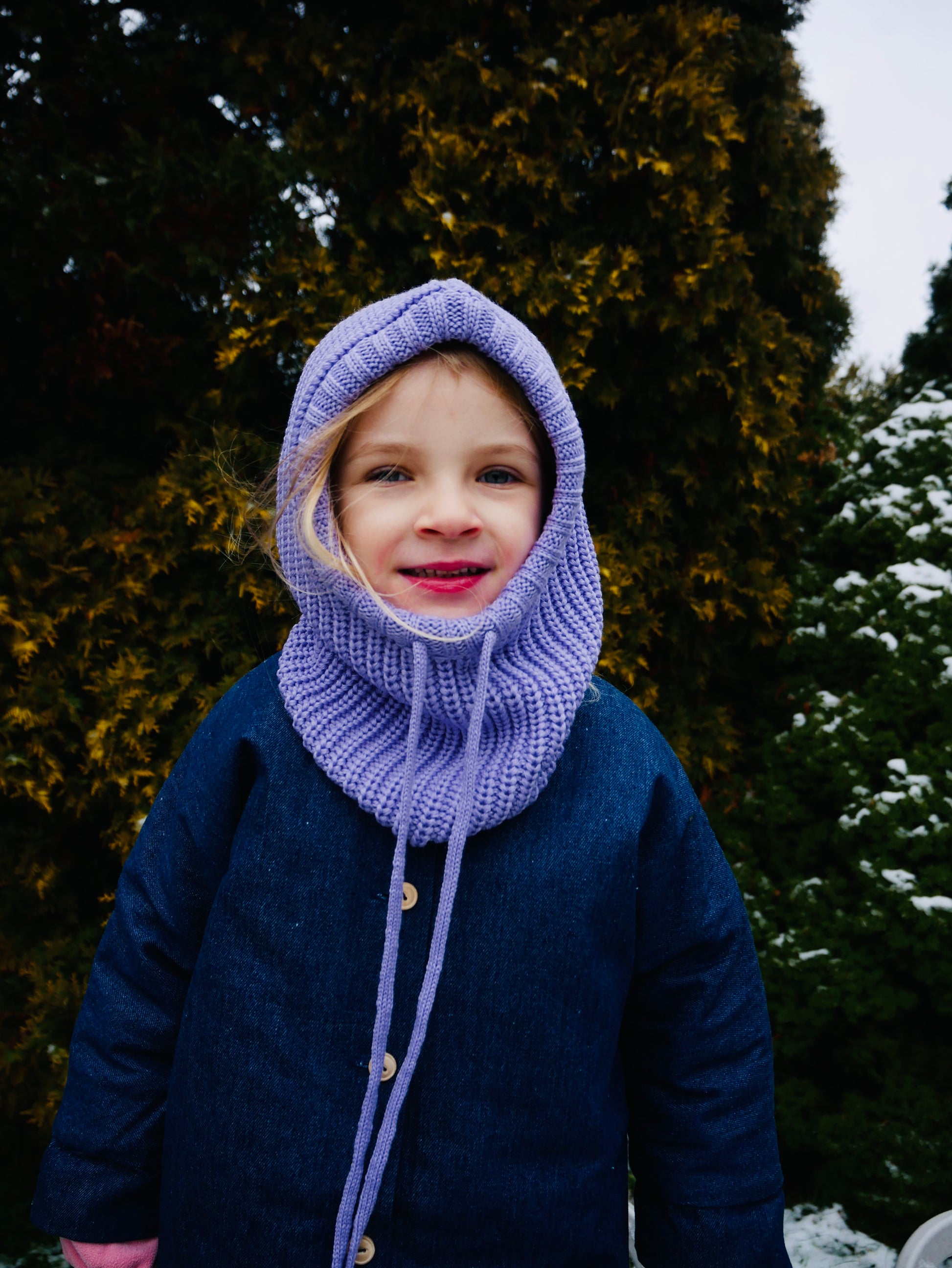 bardzo miękka i ciepła fioletowa kominiarka wykonana z włoskiej przędzy merino. doskonale ochroni główkę i szyjkę przed zimnem. dostępna w jednym rozmiarze pasującym dla dzieci w wieku od 1,5 roku do 9 lat.
