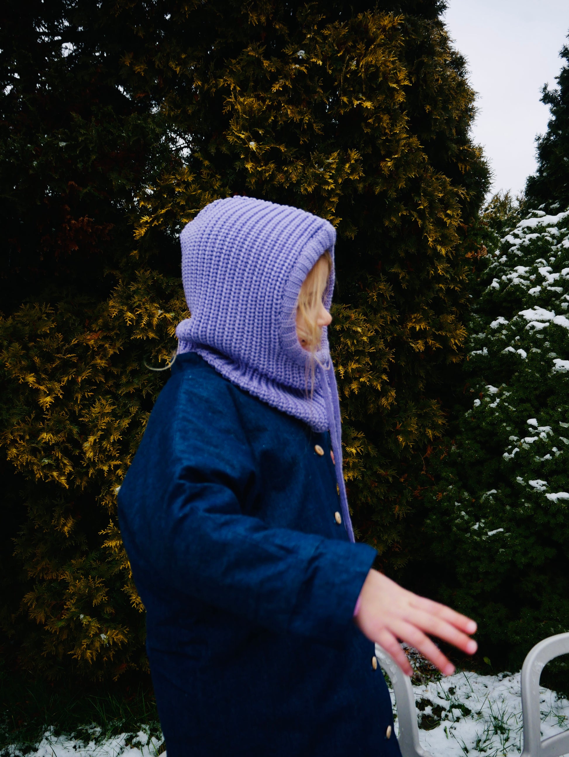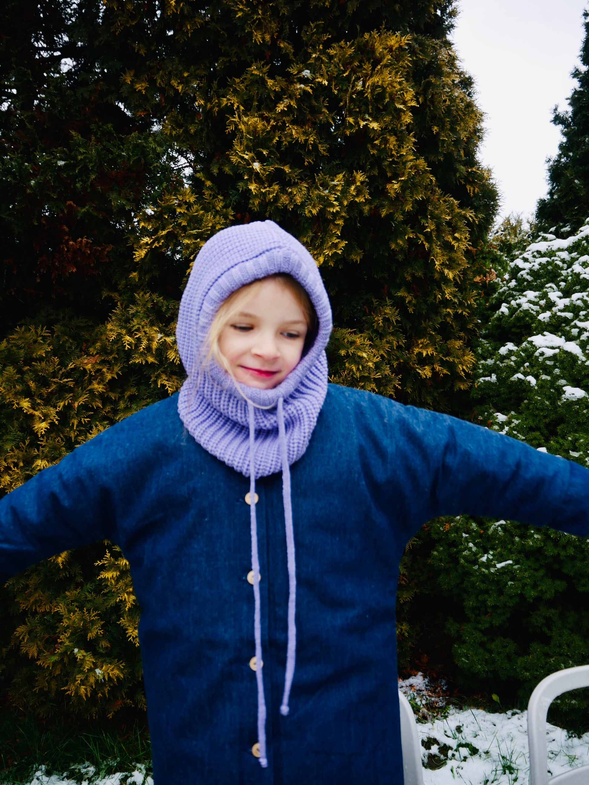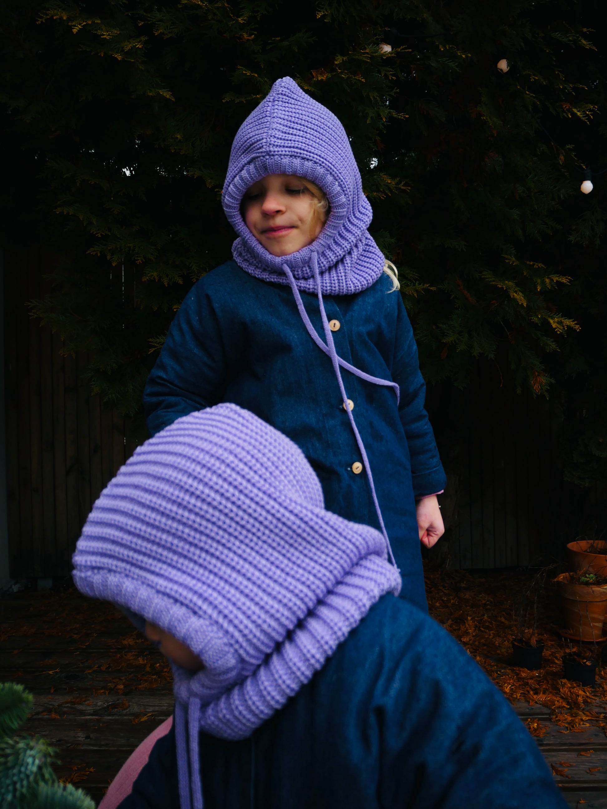 bardzo miękka i ciepła fioletowa kominiarka wykonana z włoskiej przędzy merino. doskonale ochroni główkę i szyjkę przed zimnem. dostępna w jednym rozmiarze pasującym dla dzieci w wieku od 1,5 roku do 9 lat.