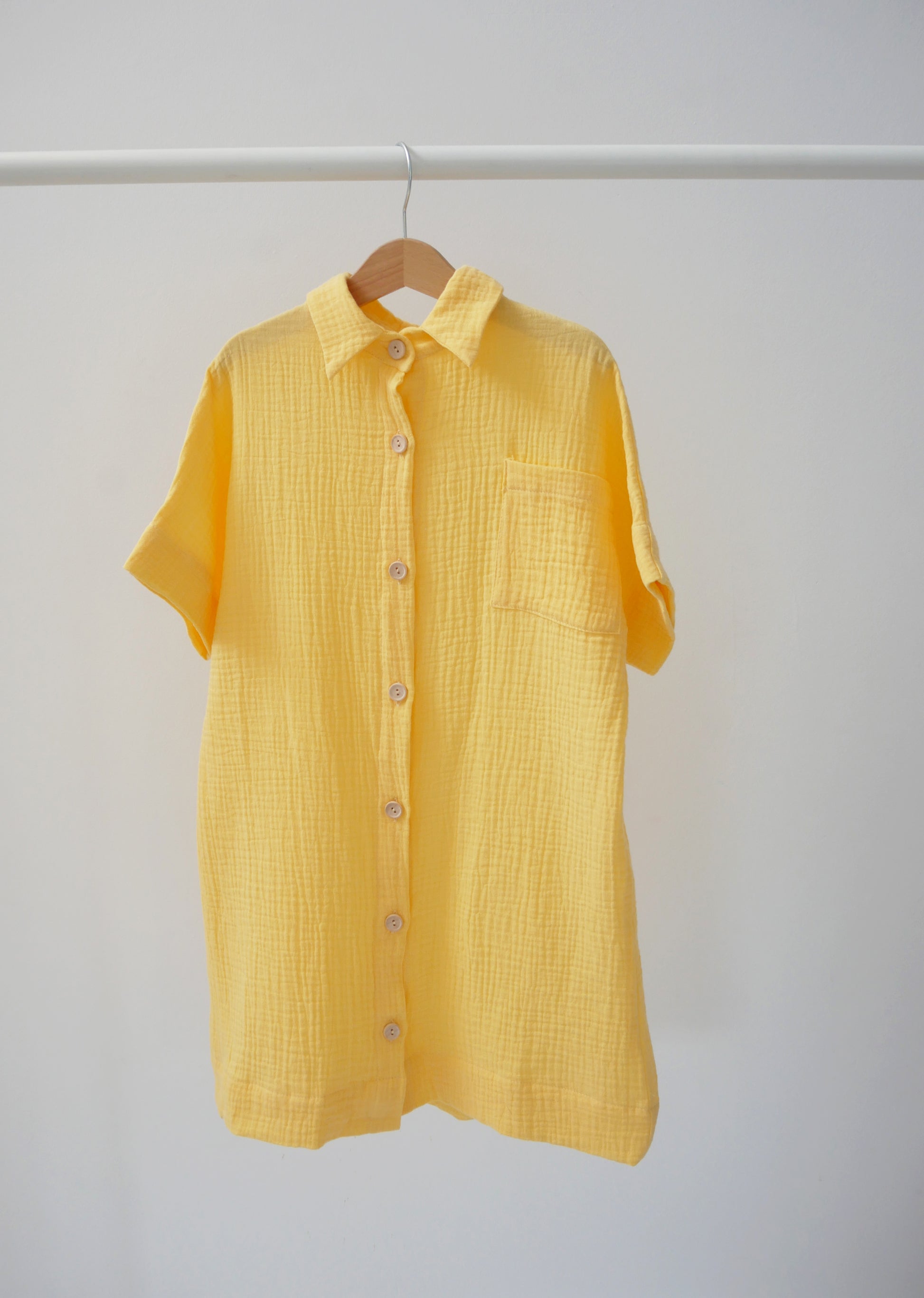 piękna sukienka o koszulowym kroju z krótkim rękawem. z kołnierzykiem, zapinana na drewniane guziczki, z małą kieszonką. uszyta z mięsistego muślinu.